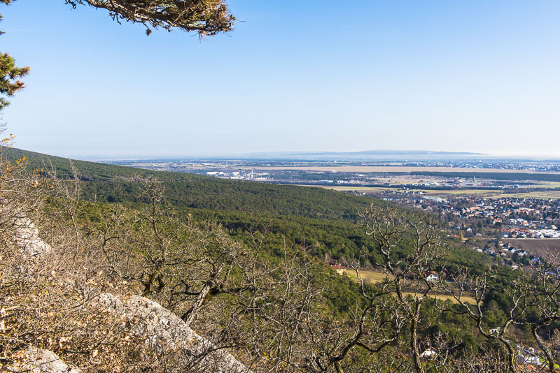 Having continued my walk up and across the plateau, then turning to the left and back, I pass by the "lily meadow" (behind the trees in the centre of the picture). The view goes to Winzendorf, in the backgrouind the Wechsel and Semmering region with the prominent Sonnwendstein.