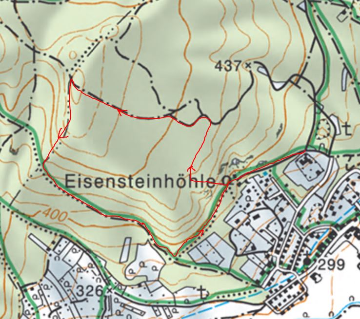 As I have to drive to Bad Fischau, I take this as a reason for this choice of route. The drive goes to the parking area near the Eisenstein cave. Starting my walk to the cave first, then, passing by the cave and the homonymeous hut (which, in fact, is kind of a small inn outside the village), on little traces of a narrow trail (marked with small red dots), an extremely steep slope up to the view point.