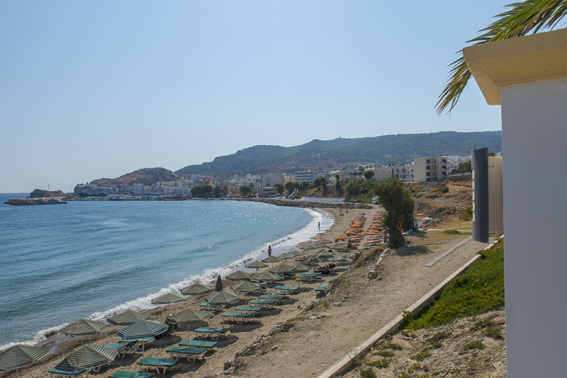 Das Hotel Electra Beach liegt am nördlichen Ortsrand von Pigadia (Karpathos), dem Hauptort der Insel, am Sandstrand der Bucht, übrigens die einzige Stelle, wo man, wenn man ins Meer baden geht, auch im Wasser noch Sand unter den Füßen hat - überall anders hat man im Wasser groben Schotter oder rutschige Steinplatten, beides nicht wirklich angenehm.