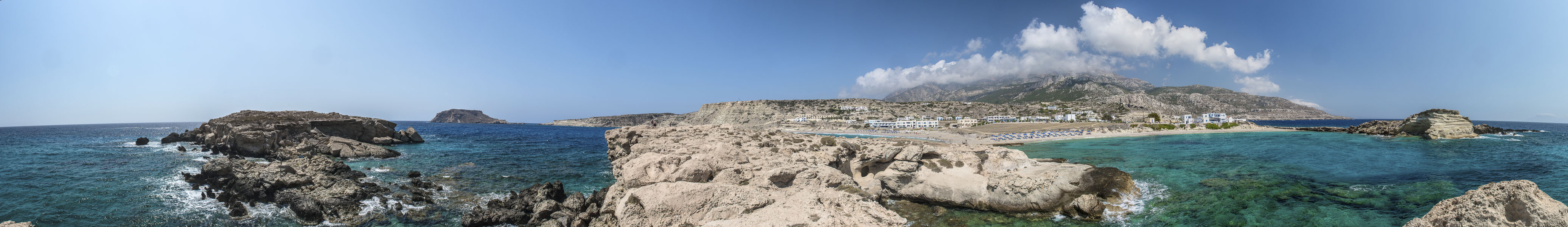 Panoramabild der Strände 3 und 4 von Levkos. Rechts im Hintergrund der Kali Limni, in Wolken gehüllt.