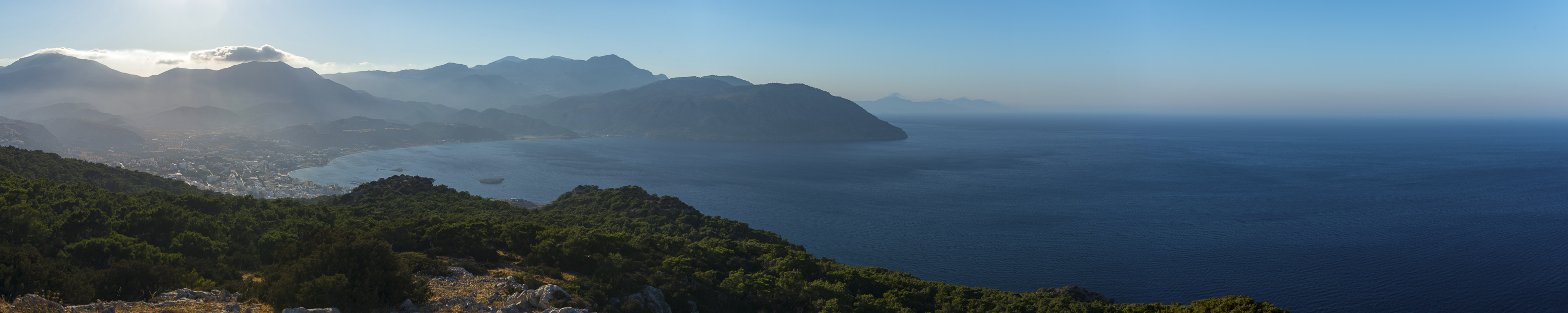 Panoramablick auf Pigadia und Karpathos Südost, von der Anhöhe der Vouvia - Halbinsel aus gesehen.