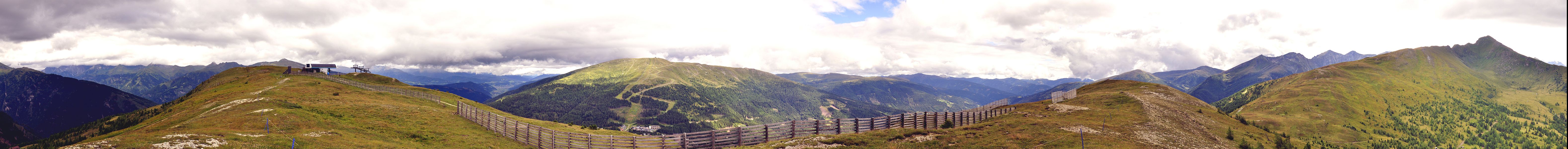 Panoramic picture from the summit of Tschaneck (2.024 m). To the left in the background Niedere Tauern with the summits in clouds. Then Aineck (2.210 m), the Nock mountains and the Lieser valley, finally far right Kareck (2.481 m), with Reitereck (2.792 m) behind to its left.