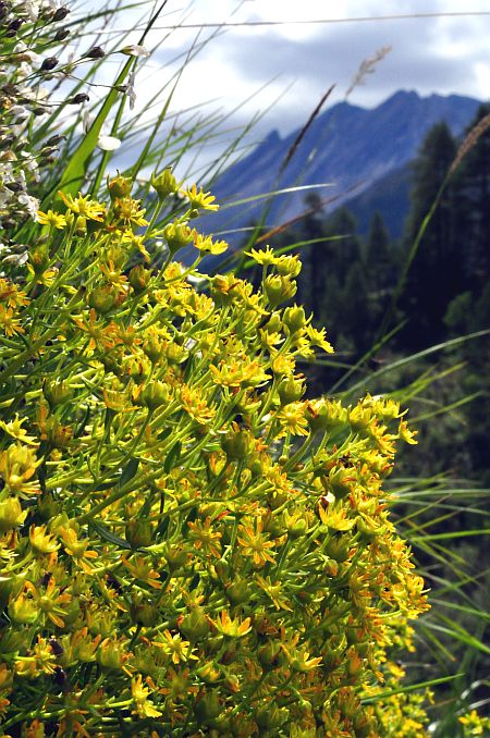 Bach - Steinbrech (Fetthennen - Steinbrech, Saxifraga aizoides) am durchfeuchteten Abhang neben dem Weg