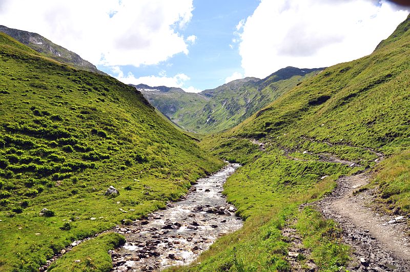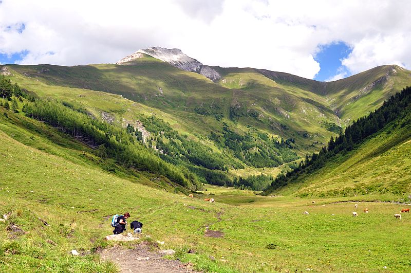 Blick zurück, bei der Talbiegung ist die Sticklerhütte. Im Hintergrund das Weißeck (2.711 m).