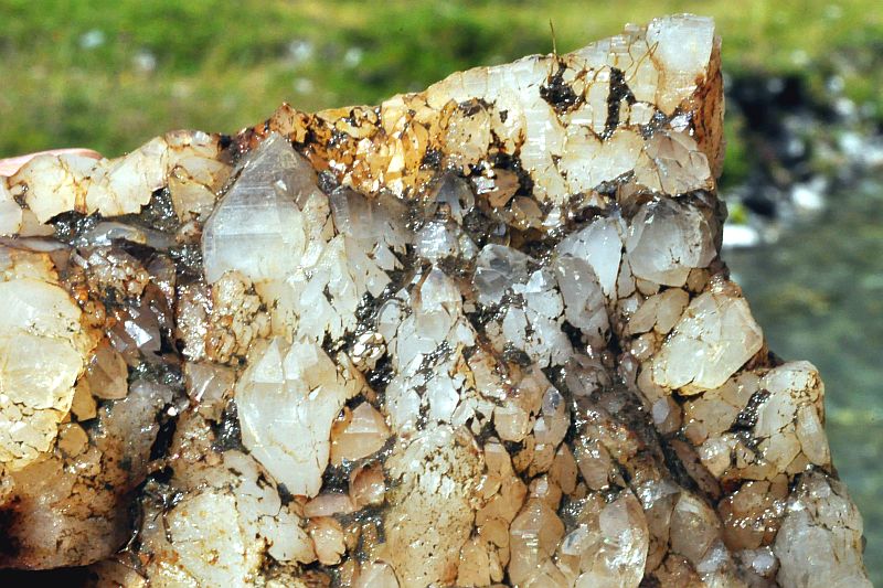 Dieses Gebiet ist auch reich an Bergkristallen. Nachdem wir am Bach gesucht und nur einige winzige Kristalle gefunden haben, findet Marlene diese Kristallstufe direkt am Weg - wir müssen sie aber aus dem Erdreich ausgraben. Grob gewaschen in der Mur, benötigt sie noch etwas die Bürste.