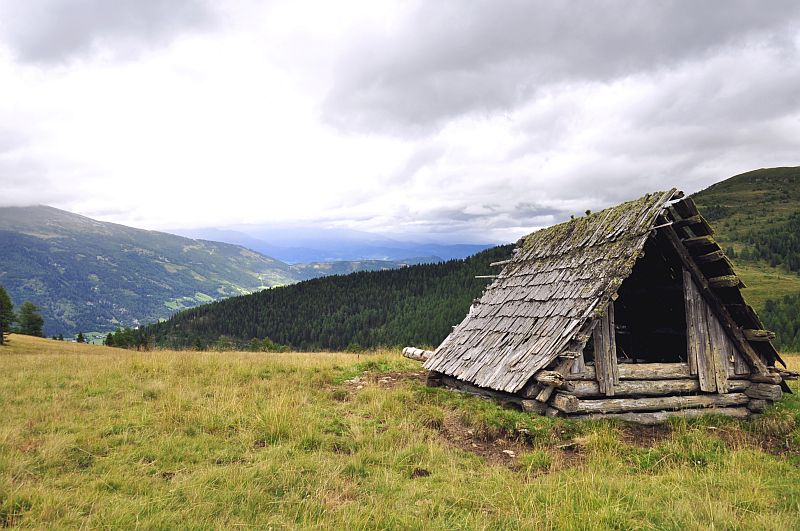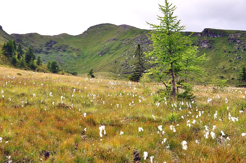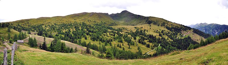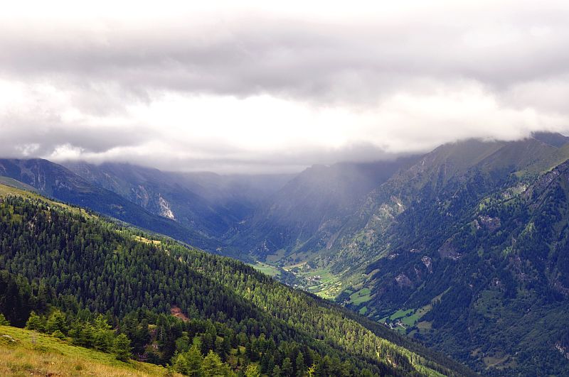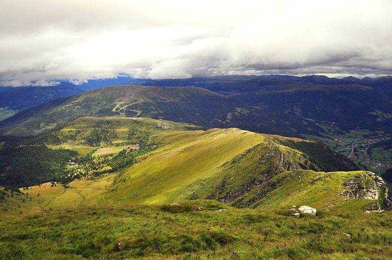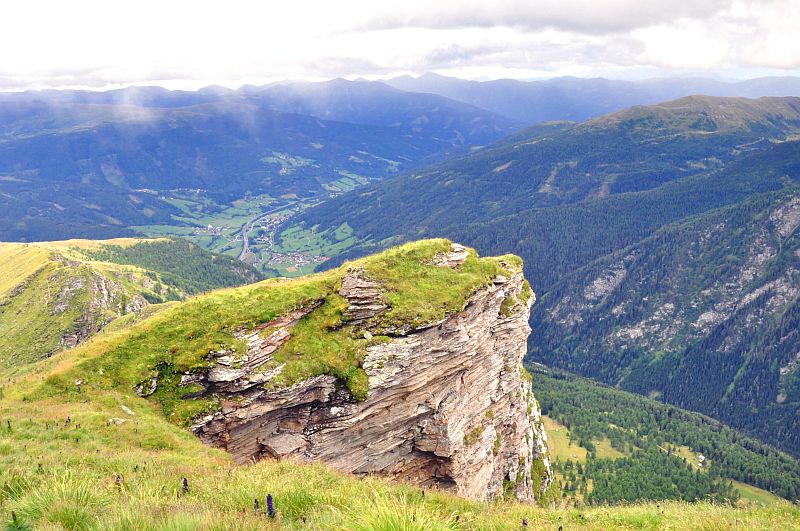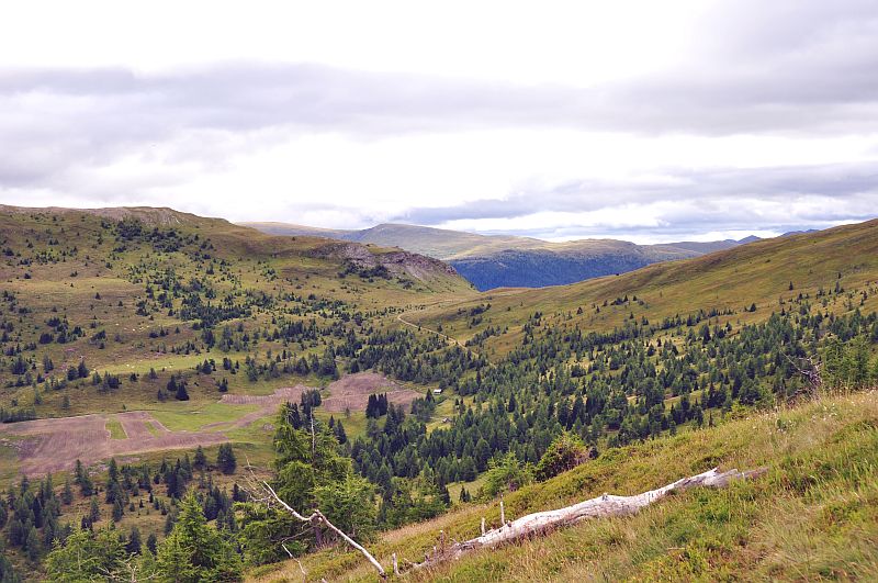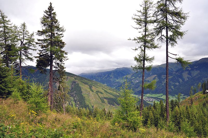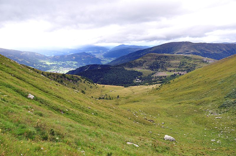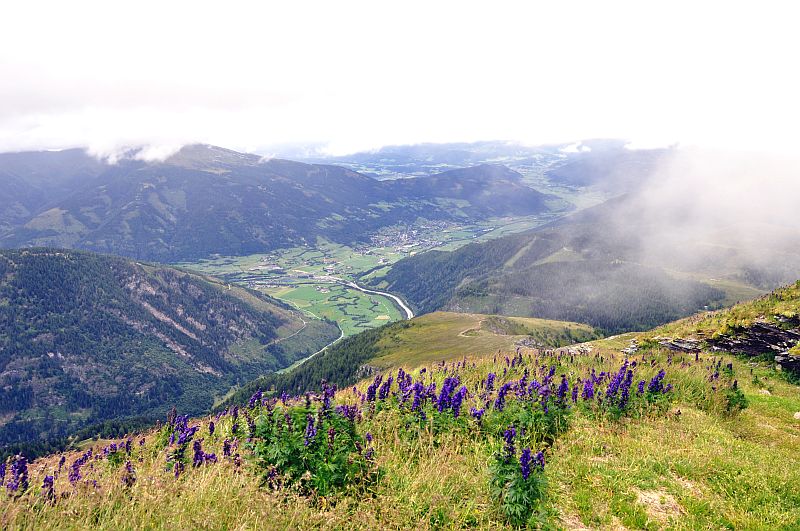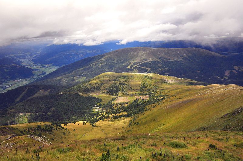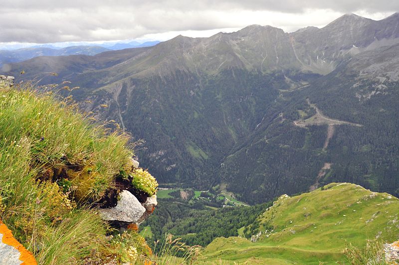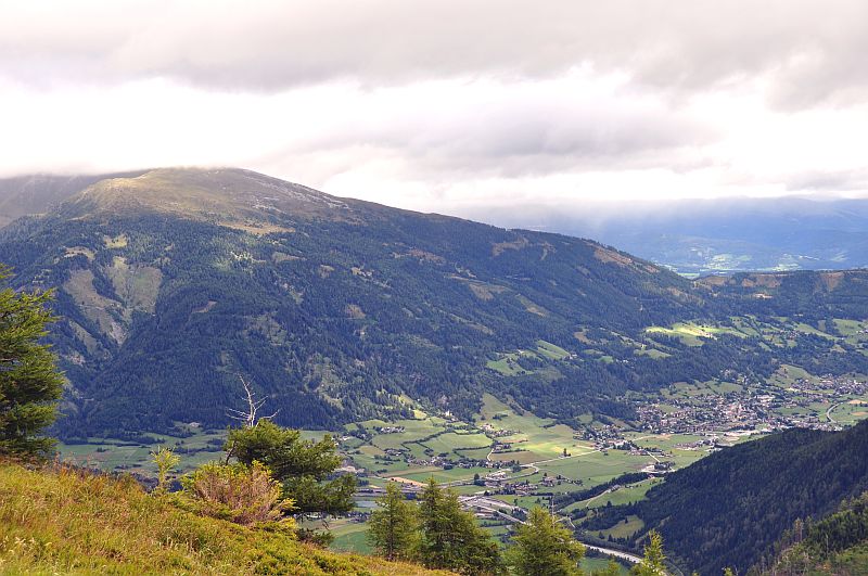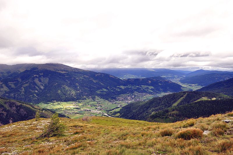 Zunächst muss man vom Katschberg aus um das Tschaneck herum, um ans Kareck heran zu kommen. Etwa 2 km kann man noch mit dem Auto fahren, dann ist Fahrverbot, und es geht zu Fuß weiter. Blick ins Tal zur Ortschaft Unterweißburg.