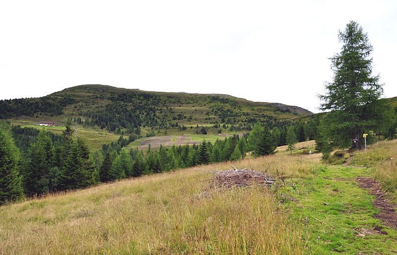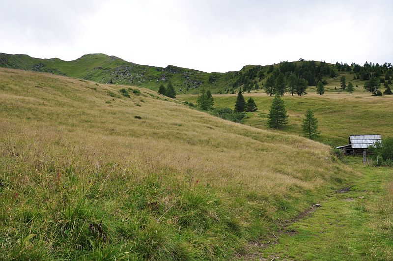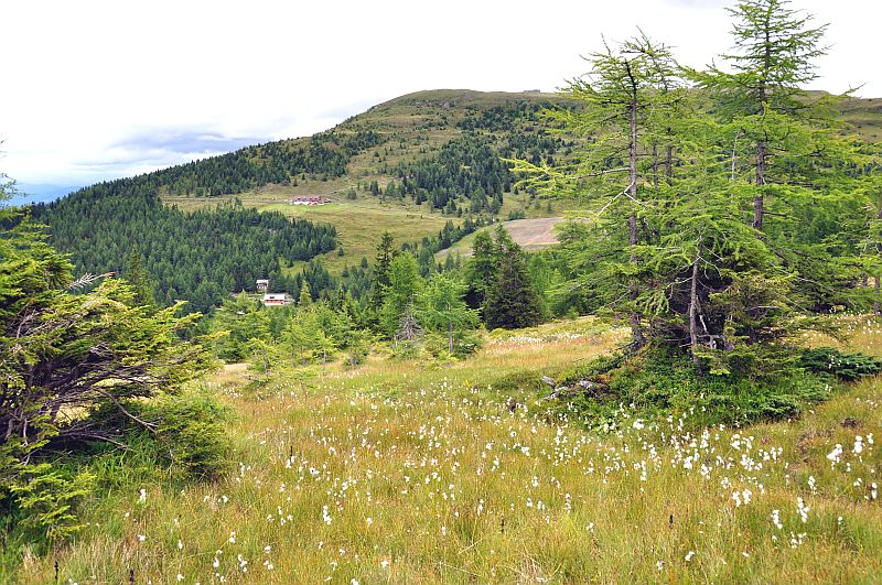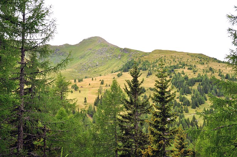 Blick zurück zum Tschaneck mit der Hansbauernhütte, die Pritzhütte unterhalb im Wald verborgen.