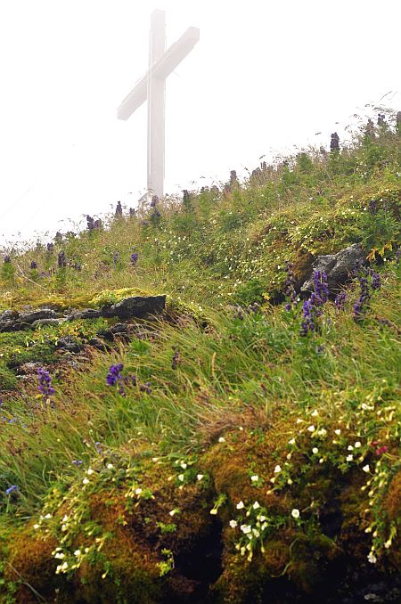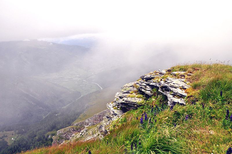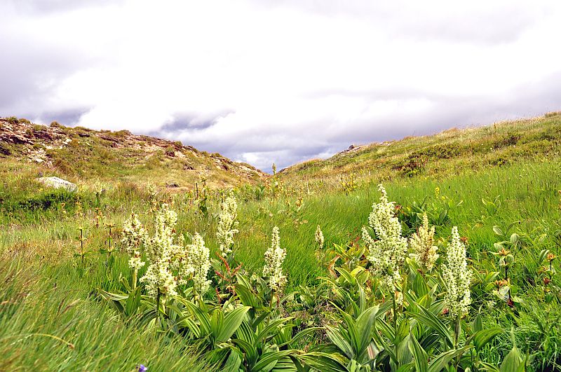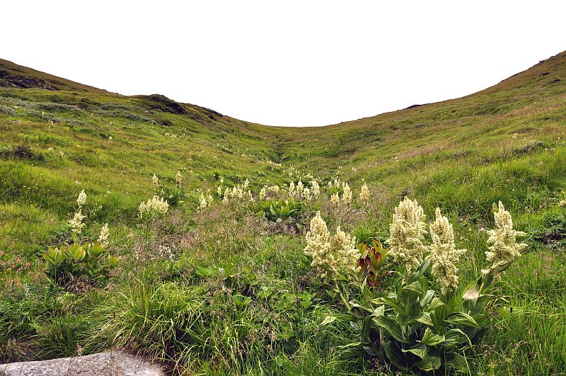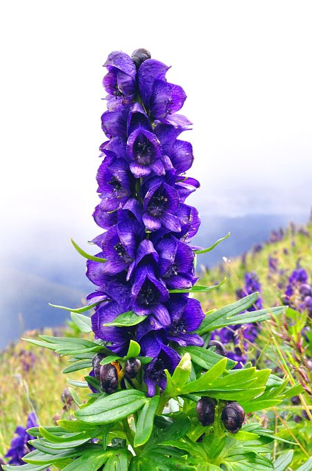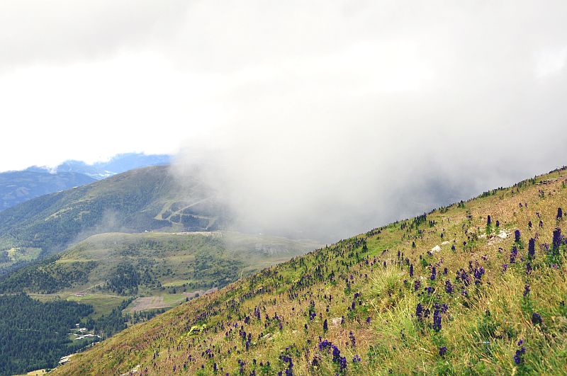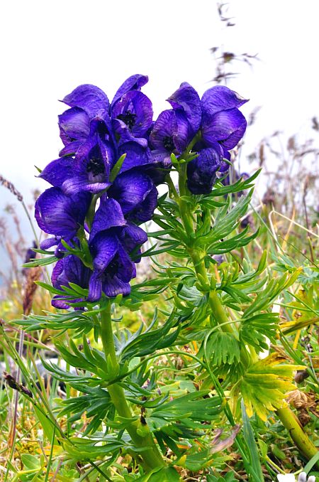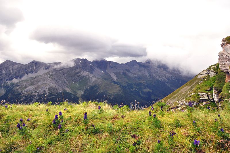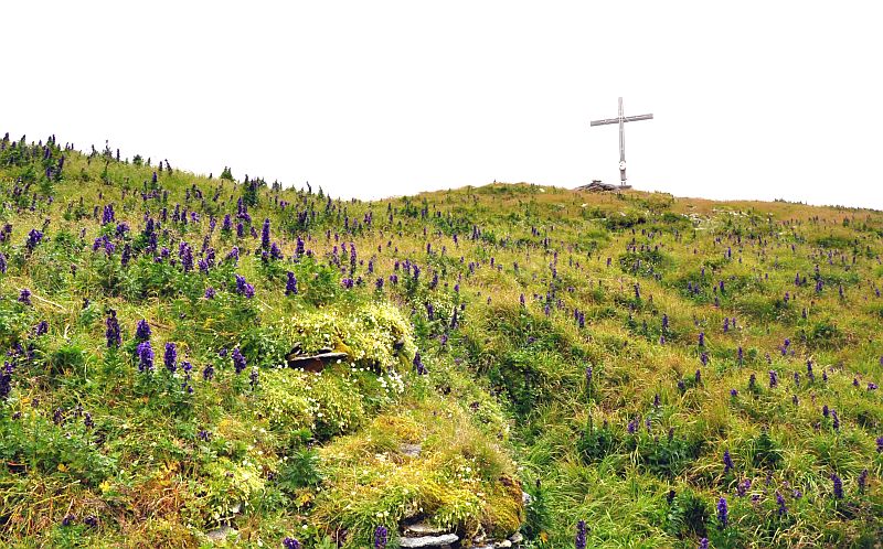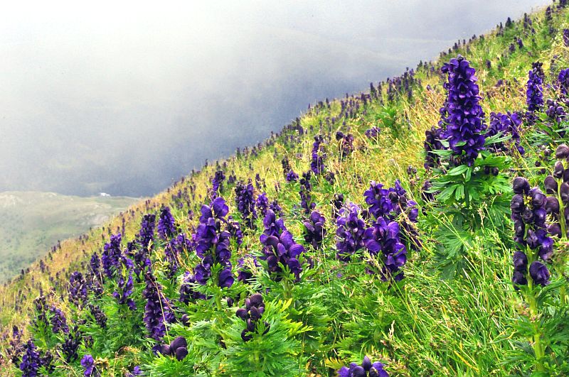 Unmengen von blauem Eisenhut (Aconitum napellus) überziehen den Gipfelhang des Karecks.