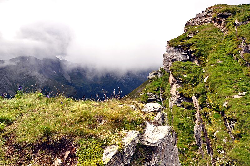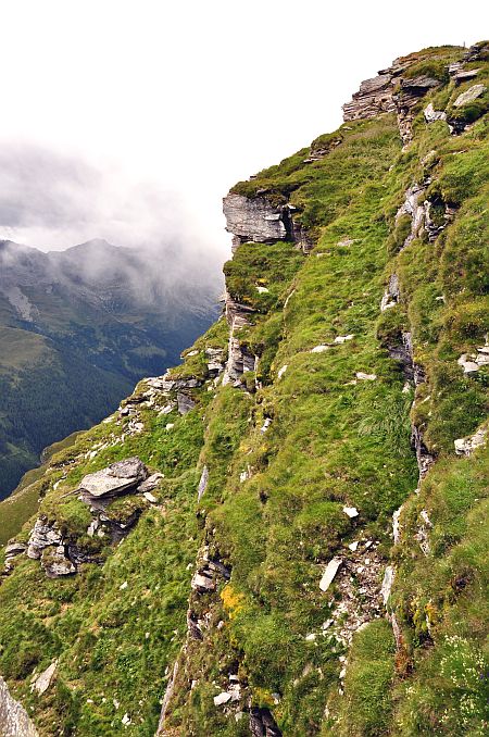 Es geht jetzt über extrem steile Grashänge ins Gontal hinunter. Nicht schwierig zu gehen, aber gefährlich - bei Nässe sollte man hier nicht gehen.