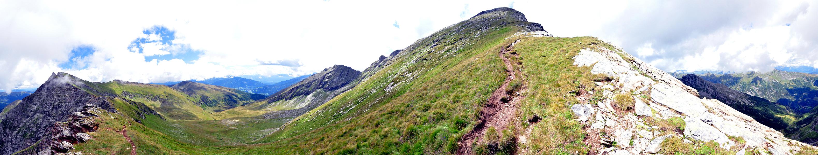 340 degree panoramic picture from the saddle between Wandeck and Reitereck. Far left is Wandeck, then the valley called Maltinger Alpl, behind is Stubeck (2.370 m), followed by the view down to the Malta valley, Faschaunereck and Reitereck. Right of Reitereck is Girlitzspitze (2.468 m) and Kareck (2.481 m) behind it.