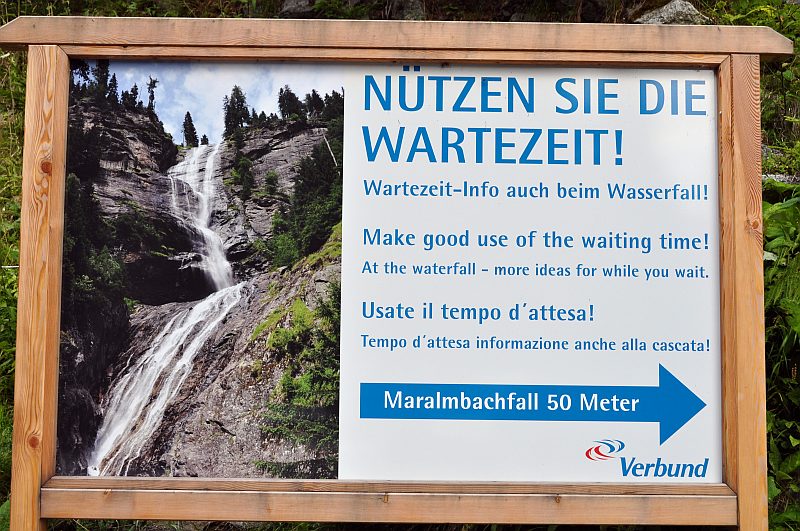 Schon nach wenigen Fahrminuten auf der Mautstraße treffen wir auf eine rote Ampel. Ein Gegenverkehrsbereich, dort ist die Straße zu schmal. Wir müssen laut Anzeige etwa 20 Minuten warten und folgen gern der Einladung auf der Tafel neben der Straße.