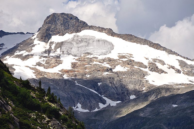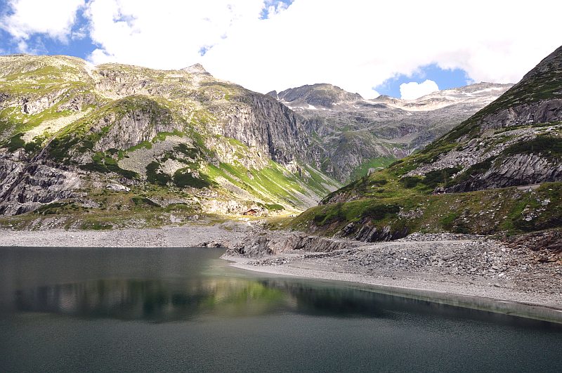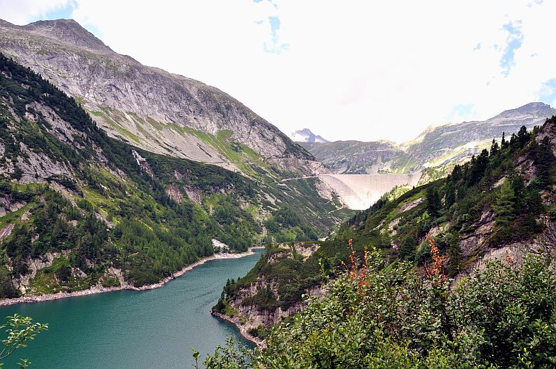 Blick über den Stausee zur Kölnbreinhütte. Im HIntergrund die Kaltwandspitze (2.822 m) und die Kölnbreinspitze (2.934 m). Petereck und Hafner sind rechts hinter dem Bergrücken versteckt.
