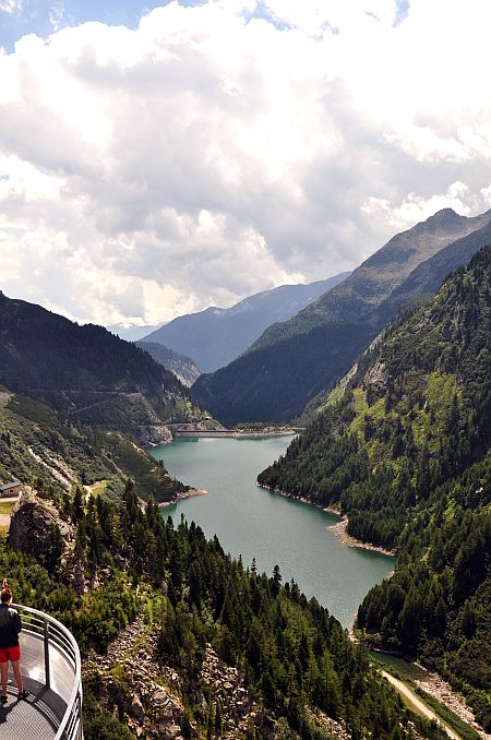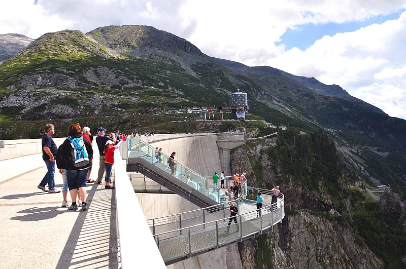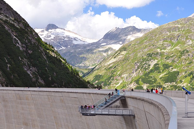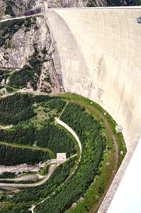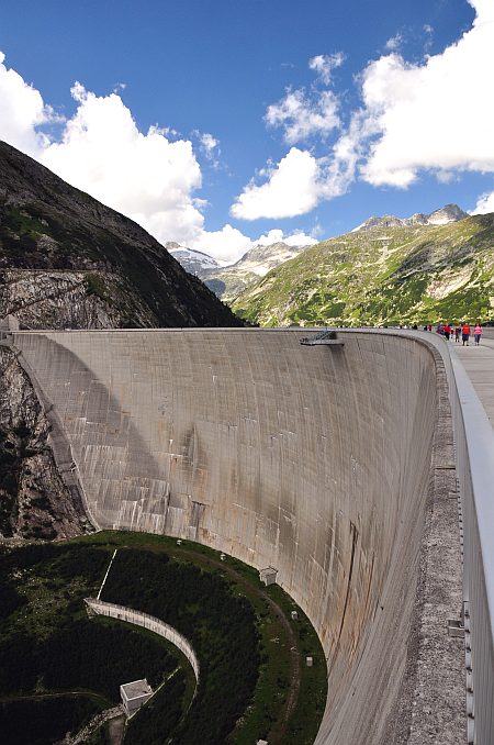 Oben angekommen. Die Staumauer ist wahrlich imposant. Das Stauziel - die Füllung bis oben - kann aber nicht erreicht werden, weil der Fels auf beiden Seiten nicht genug aushält. Technisch wäre es heute möglich, auch höhere Staumauern zu bauen, aber wenn dann der Berg links und rechts dem Druck nicht standhält, nützt das auch nichts.