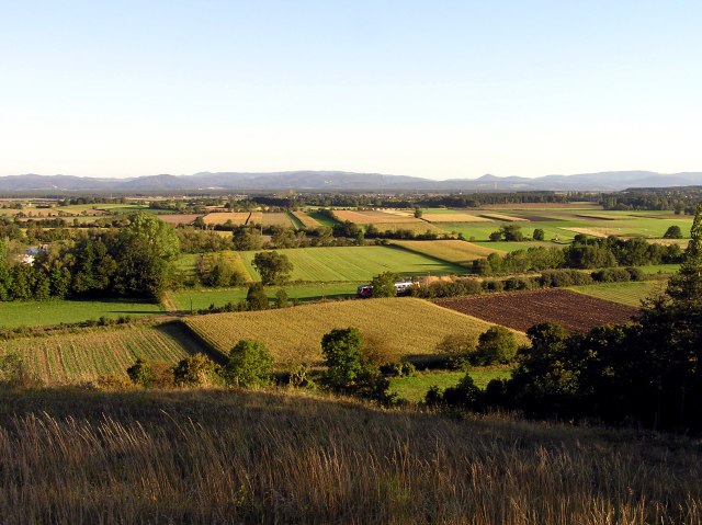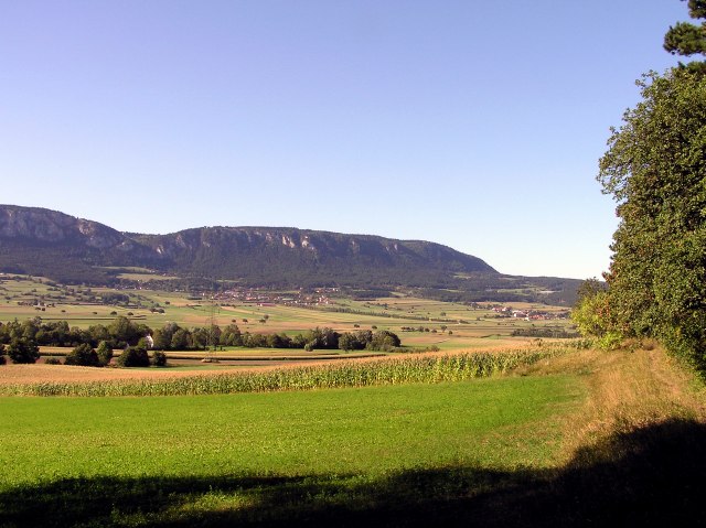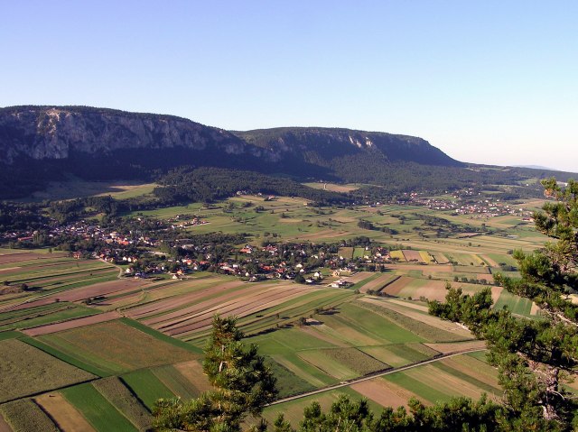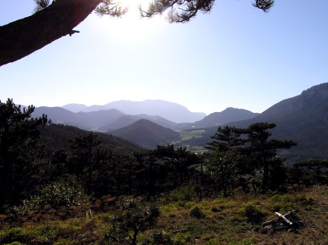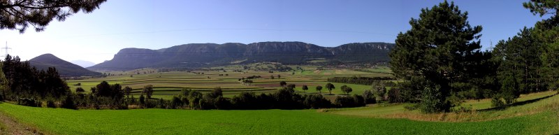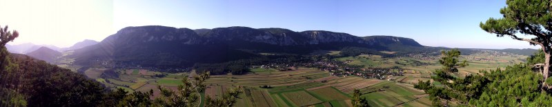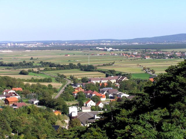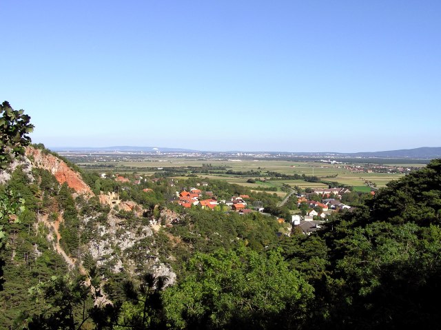 Blick vom "Steinernen Bankerl" über das südliche Wiener Becken. Am Horizont links das Leithagebirge, rechts das Rosaliengebirge ...