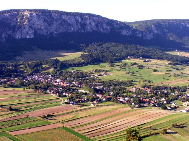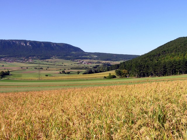 ... und die Stadt im Hintergrund ist Wiener Nerustadt, mit den Türmen des Doms ganz links. Im Vordergrund Winzendorf am Ausgang der Prosset Schlucht.