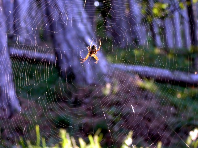Spinnennetz mit Bewohnerin, beim Abstieg im Wald.