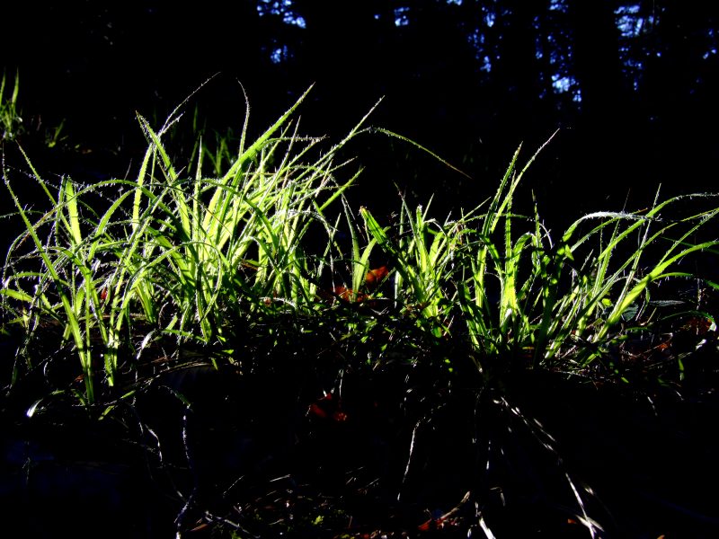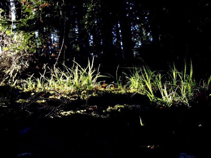 A sunray ilghts a few tussocks inside the forest of the eastern slope of Zweiberg.