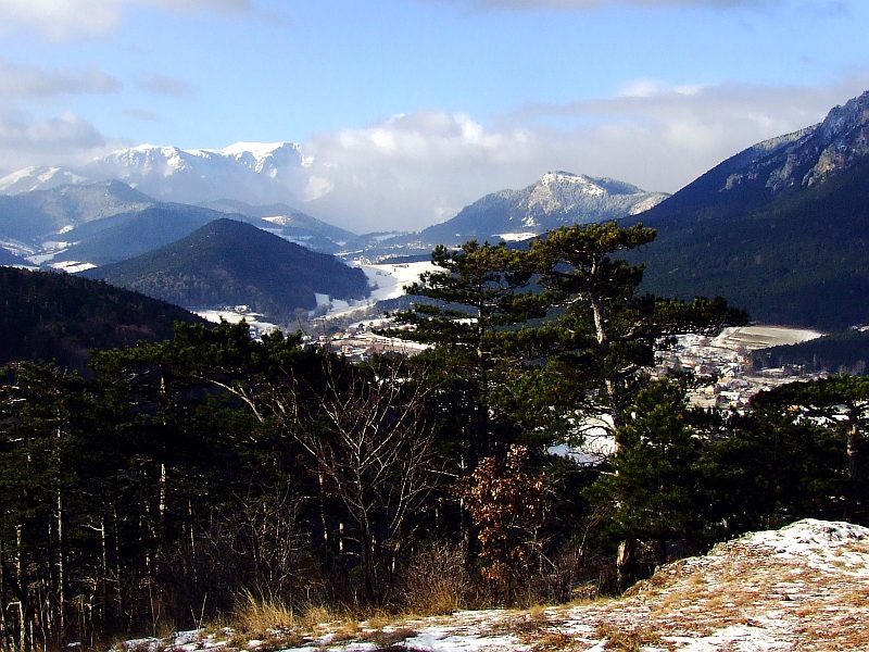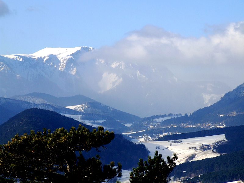 View over Hoeflein and Gruenbach to Schneeberg.