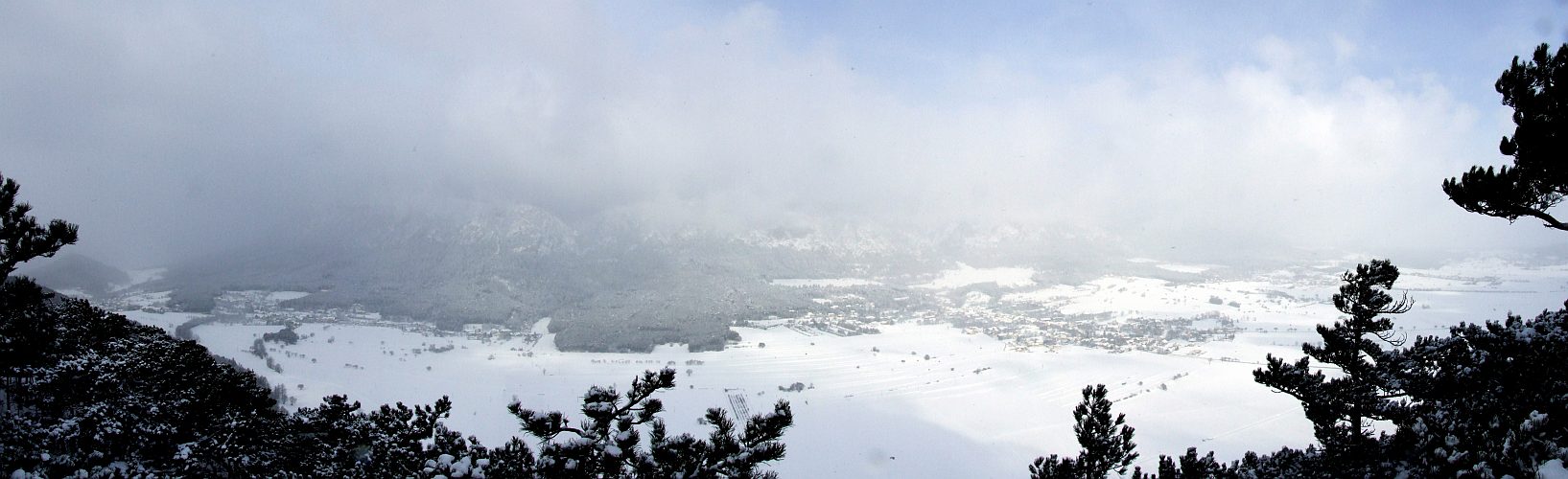Panoramic view of Hohe Wand from Kienberg. Maiersdorf has caught some sun, but the upper parts of Hohe Wand are still wrapped in clouds.