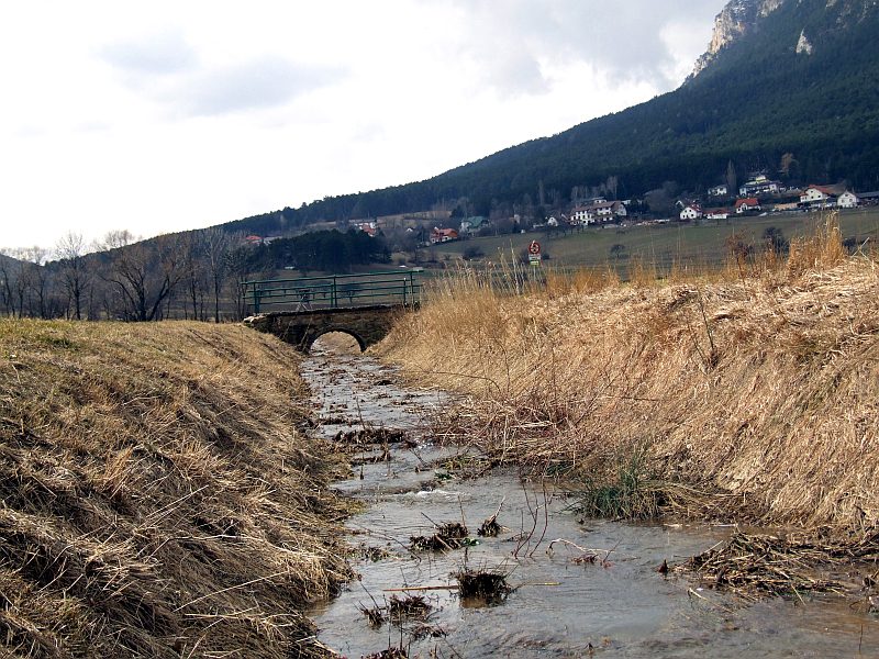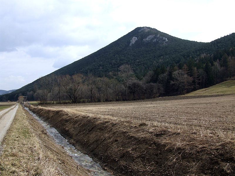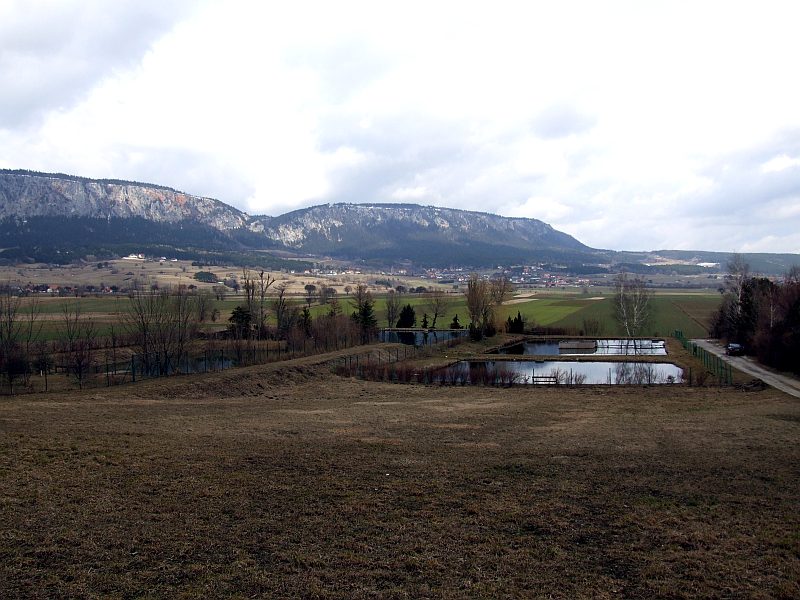 View over the fish ponds near Netting to the northeastern parts of Hohe Wand with the village of Stollhof.