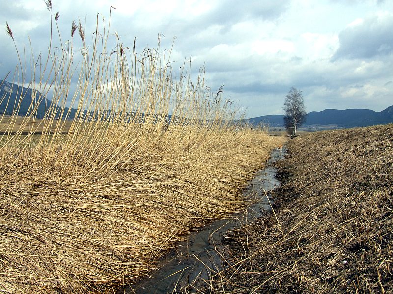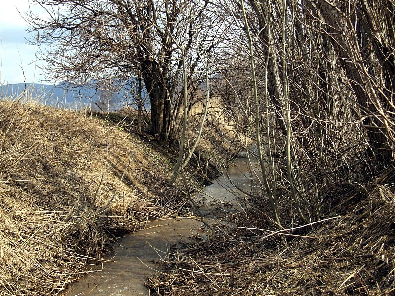 This river bed has been artificially dug out, and the fields got a drainage, the pipes of which are discharging their water into the beck.