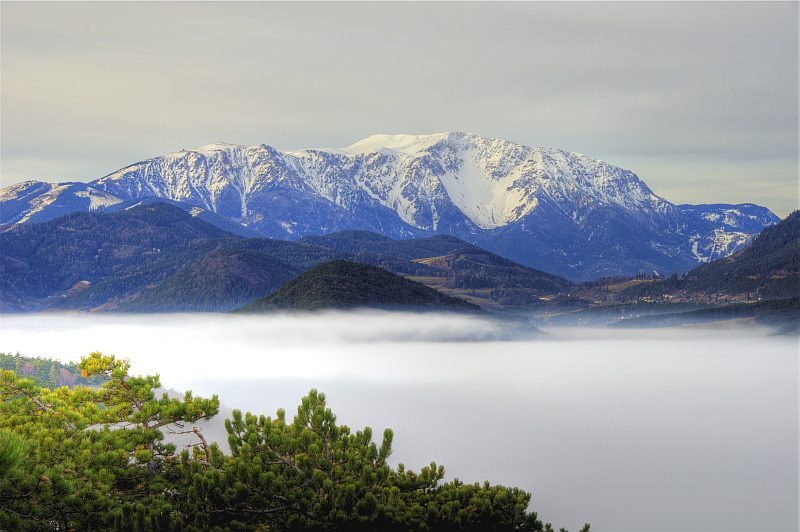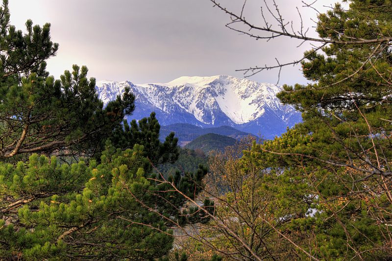 Erster Blick zum Schneeberg, zwischen den Bäumen.