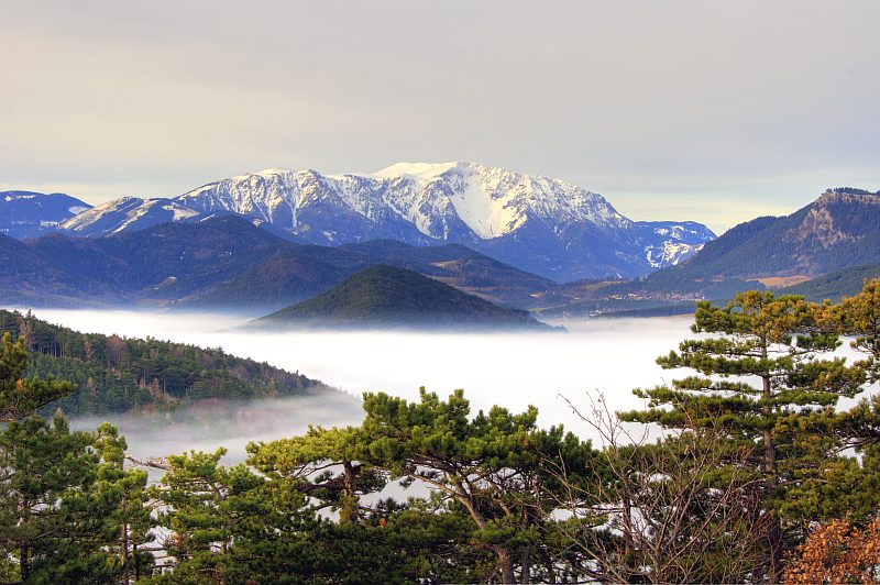 Panorama von etwas unterhalb des Kienberggipfels, diesmal mit Wechsel, Semmering, Schneeberg und Hoher Wand. Hierher oder ins Bild klicken für eine größere Darstellung.