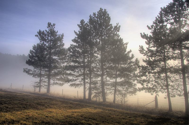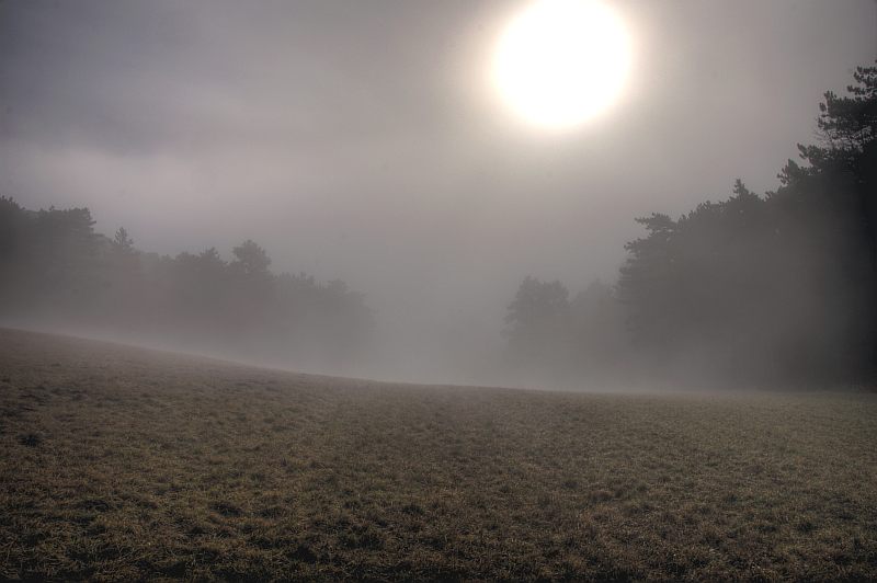 Die Wiese zwischen Kienberg und Zweiberg ist schon teilweise in Nebel gehüllt, ein wenig kommt aber die Sonne noch durch.