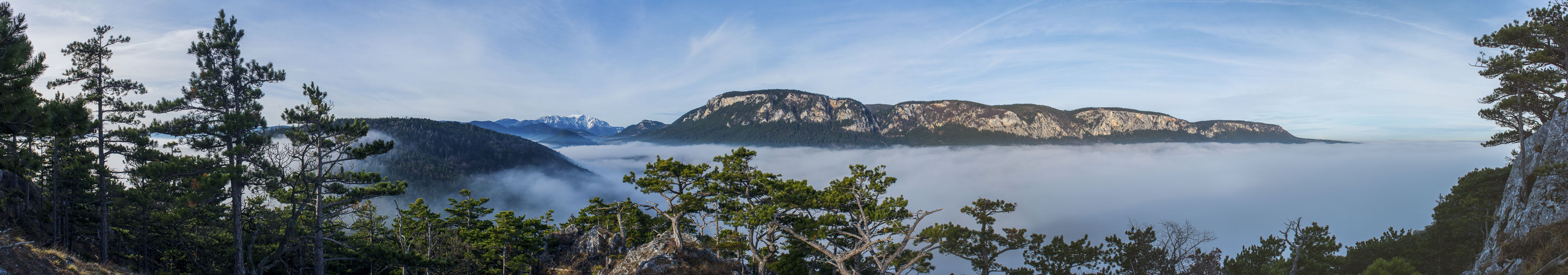 Noch ein Panorama vom Kienberggrat, diesmal noch etwas weiter: Hinter den Bäumen links der Wechsel, dann Zweiberg, Scheeberg, G´länd, Hohe Wand.