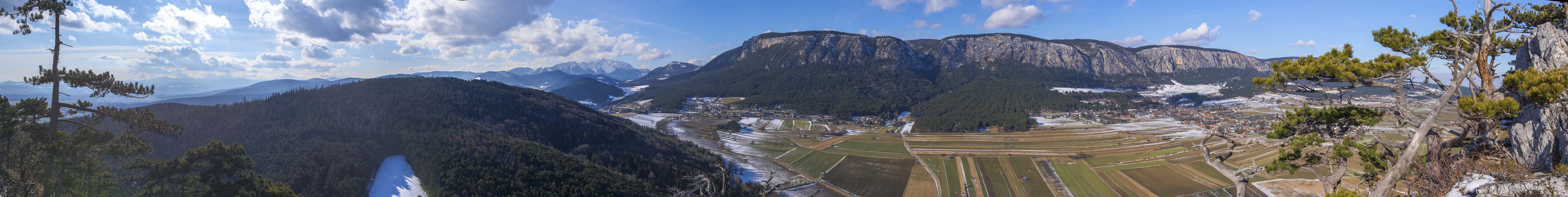 Ein letztes Panorama vom Kienberg Westgrat, diesmal schon fast vom Gipfel aus. Jetzt kommt links hinter dem Zweiberg auch das Rosaliengebirge, die Bucklige Welt sowie Wechsel- und Semmeringberge ins Bild. Links neben dem Schneeberg auch das Gahns - Massiv mit dem Krumbachstein als höchstem Gipfel.