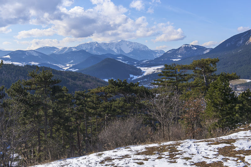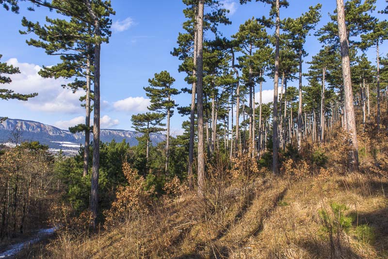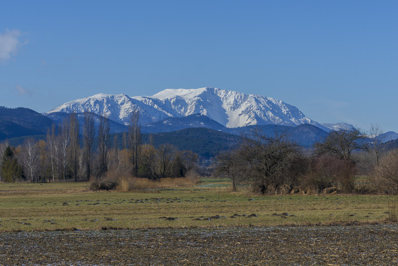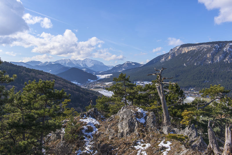 Schneeberg und Hohe Wand, rechts vor deren höchster Erhebung der kegelförmige bewaldete Berg ist der Kienberg, mein heutiger höchster Punkt.