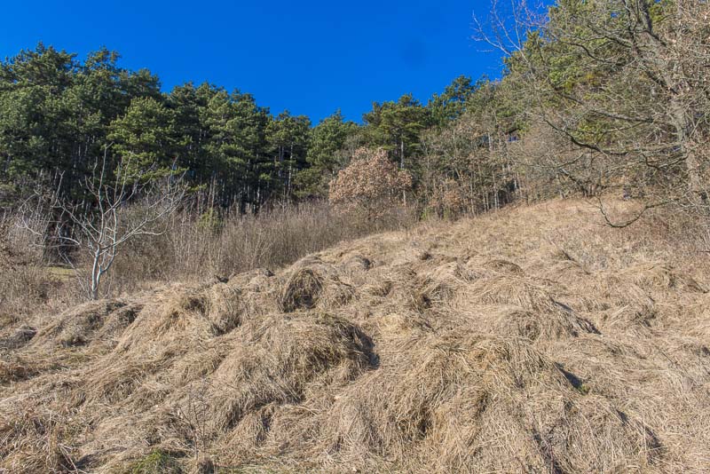 Hier überkommt mich der Zorn. Muss das Heu von der Obstwiese unterhalb wirklich auf den Abhang oberhalb geworfen werden, wo es darunter alles erstickt, inklusive der seltenen, streng geschützten Riemenzungen, die hier im Sommer blühen? Wenn jemand den Grundbesitzer kennt, bitte ihn zu informieren, denn hier wird eine streng geschützte Art an ihrem Standort vernichtet - ohne zwingende Notwendigkeit !!!