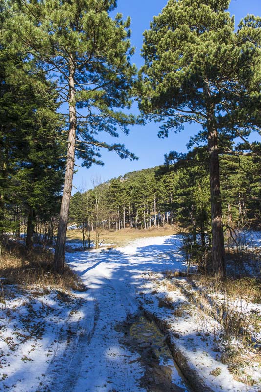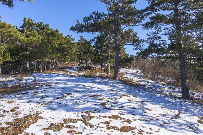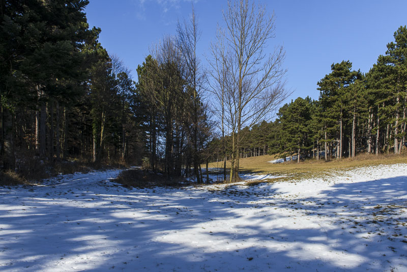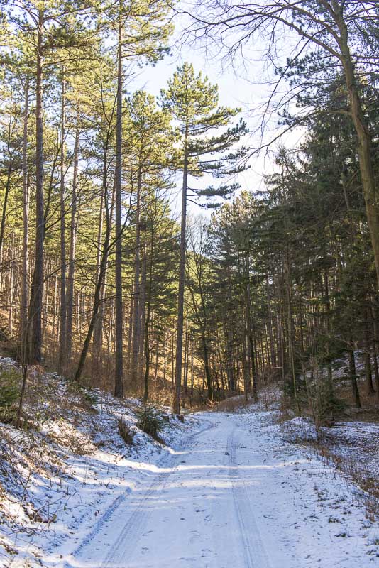 Jetzt geht es den steilen und verschneiten Wald hinunter (hier im Bild nach rechts) - da heißt es aufpassen, hier ist es rutschig.