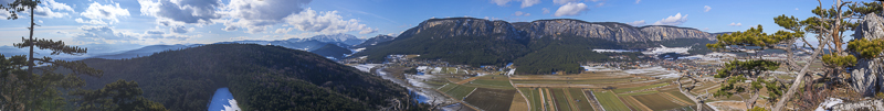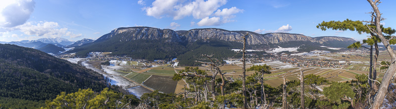 Noch ein Panorama von Schneeberg und Hoher Wand, von etwas weiter oben. Hierher oder ins Bild klicken für eine größere Auflösung.