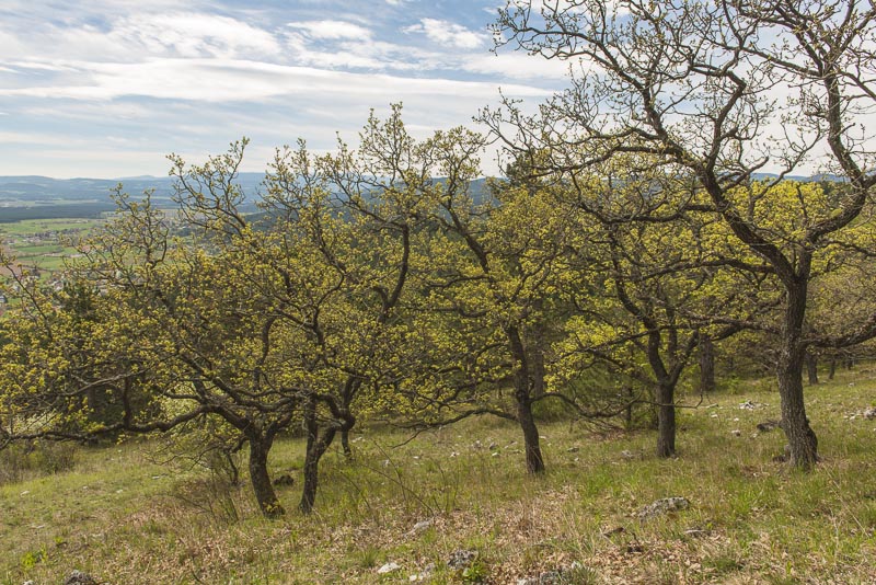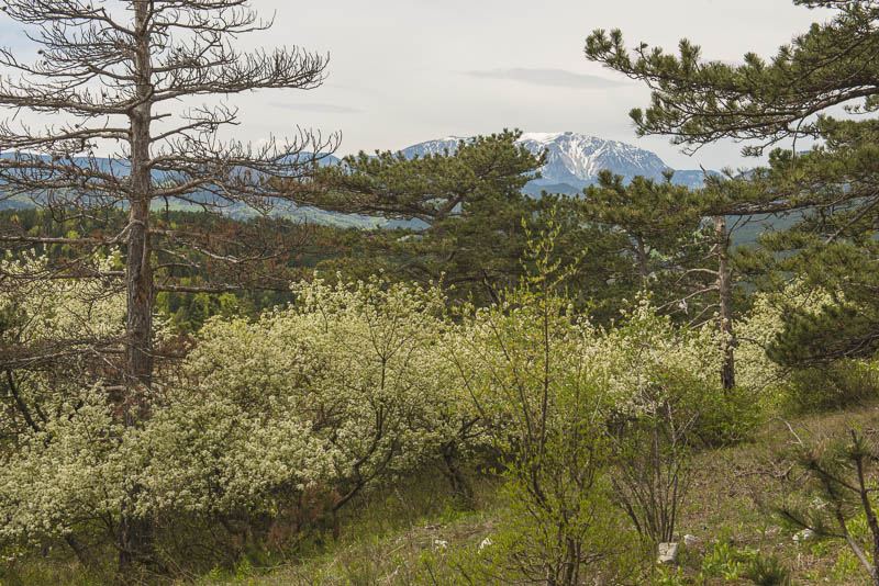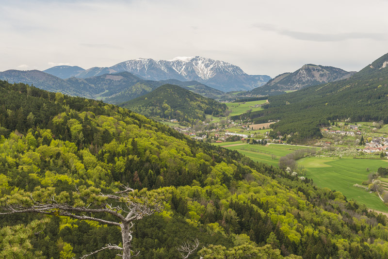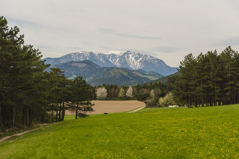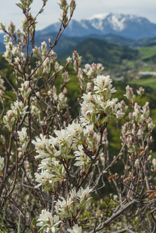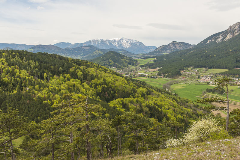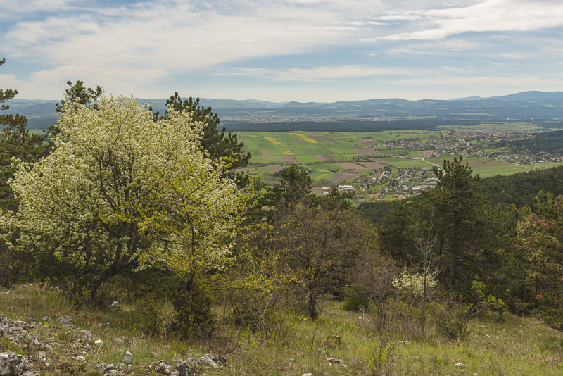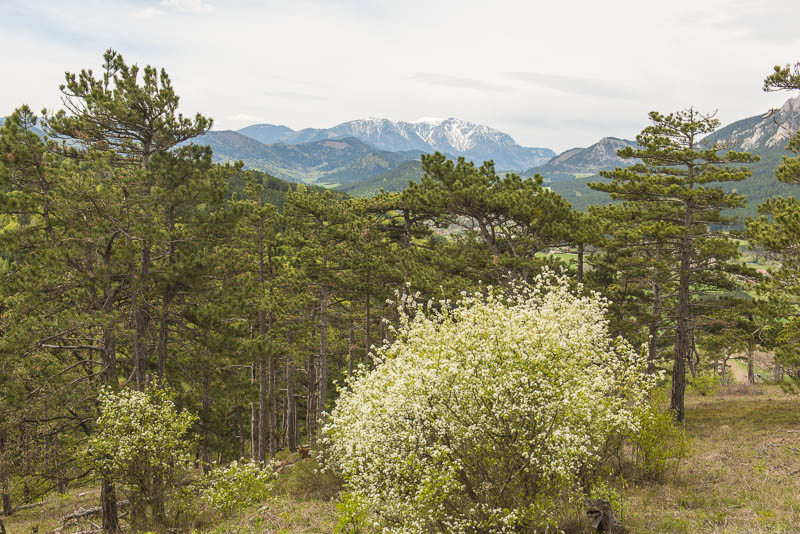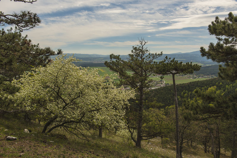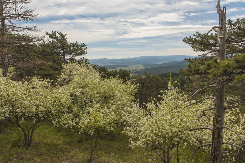 Blick zur Buckligen Welt und zum Wechsel. Auch hier viele blühende Steinweichseln (Prunus mahaleb).