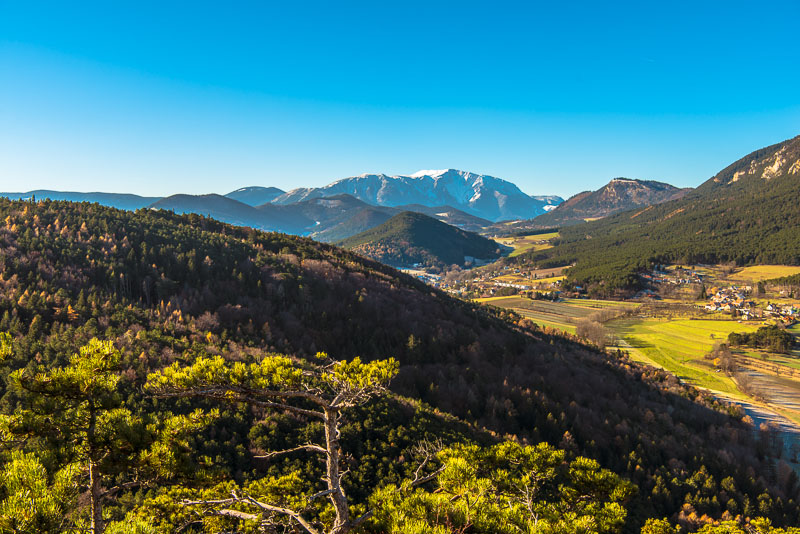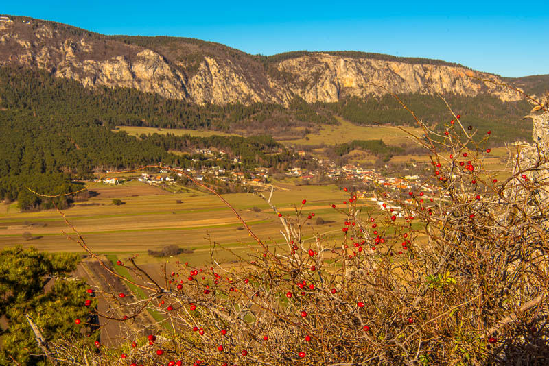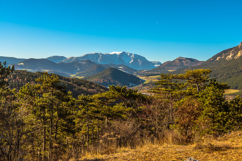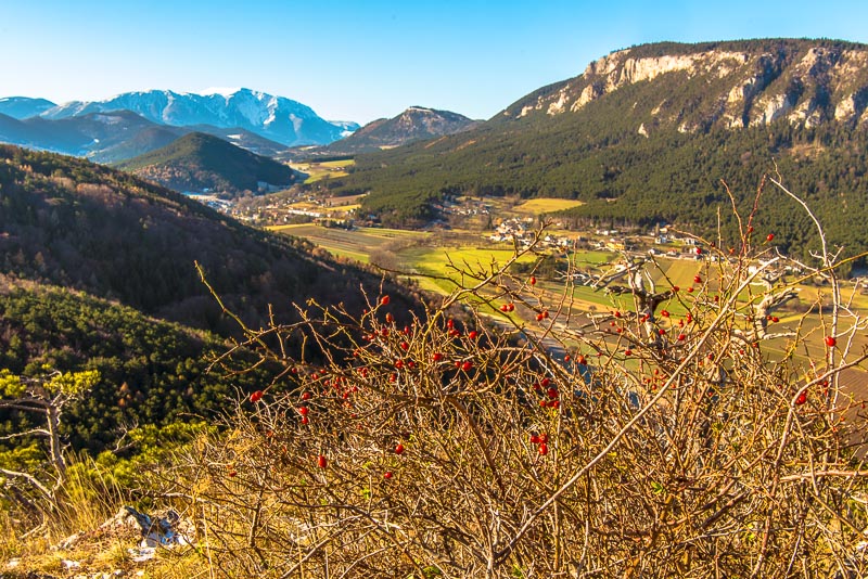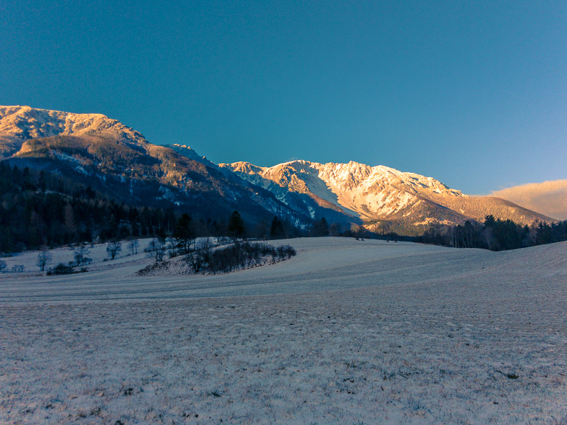 Bright sunshine, after a cold rain (and snow) front from the North. Temperatures in the valley only a few above 0 °C, in the shadow inside the forest everything is frozen, with a slight dust of snow. As my car is needed elsewhere, I take the mountain bike to Strelzhof and up to Kienberg from there (I leave the bike before the steep and rocky part of the path called Irmasteig).
