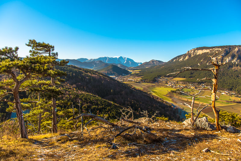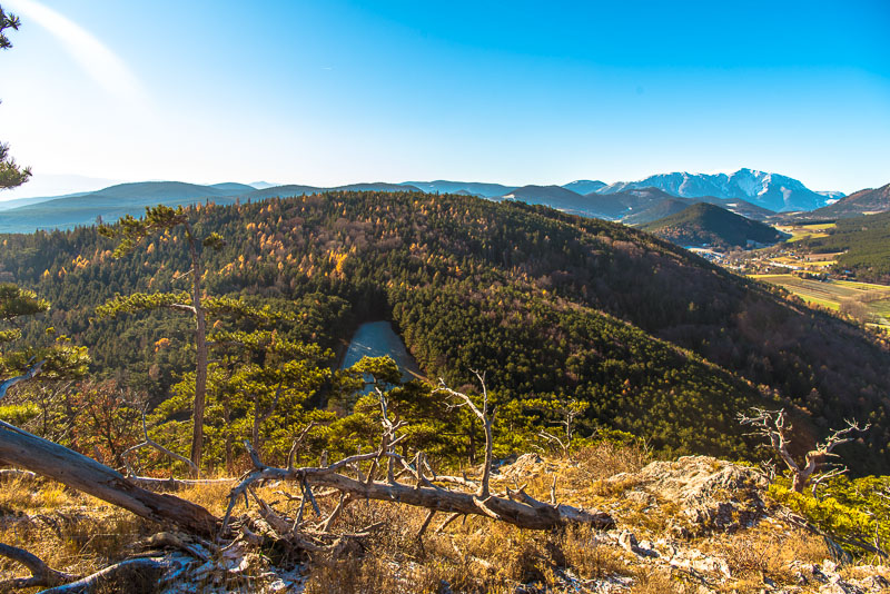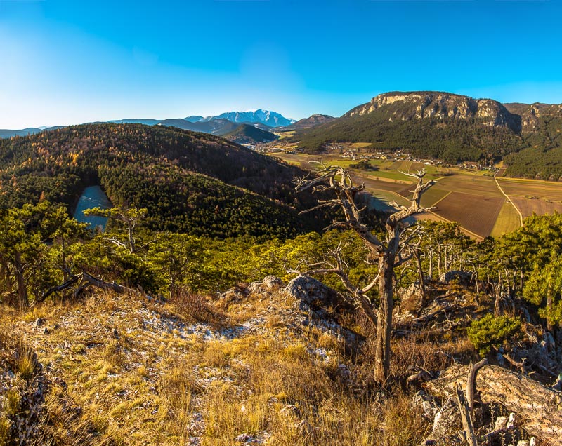 Panoramic view of Schneeberg and Hohe Wand, as seen from the western ridge of Kienberg. Click here or into the picture for a larger display.