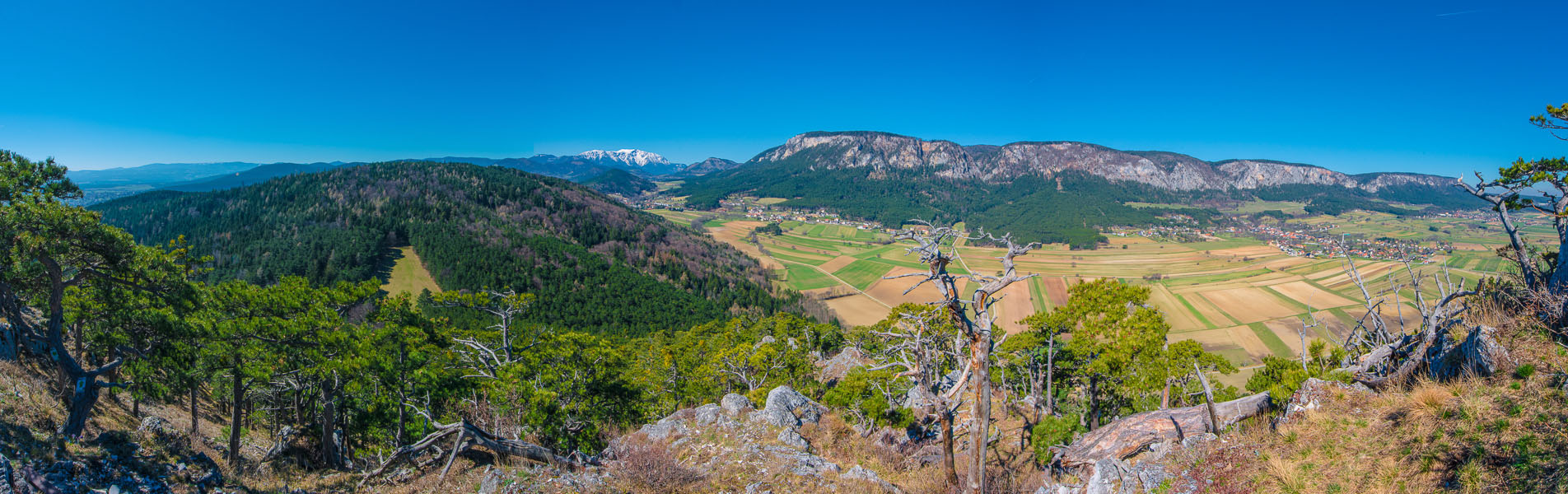 Panoramaaufnahme vom Kienberg. Links Wechsel, dann Schneeberg und Hohe Wand.