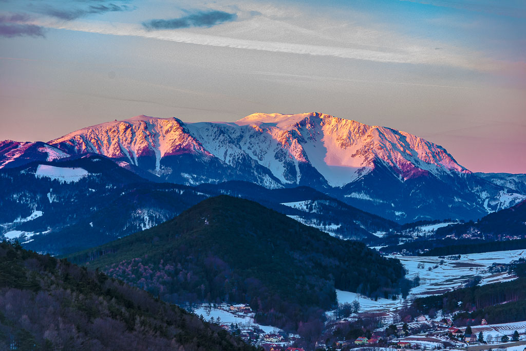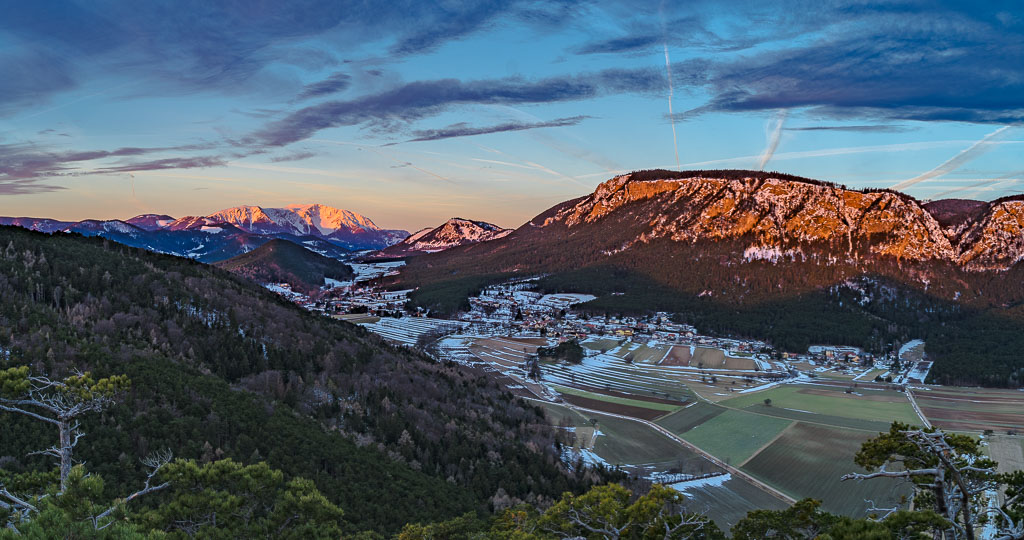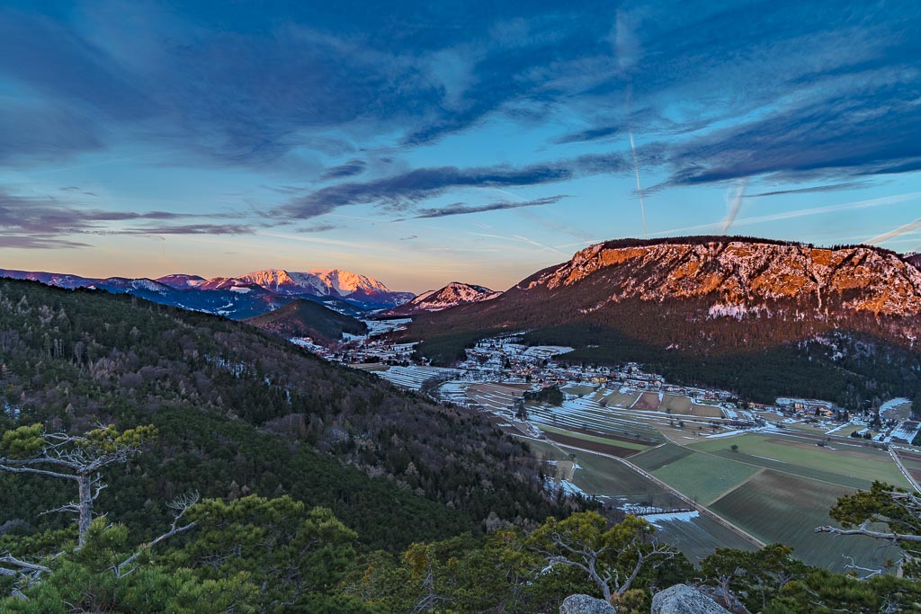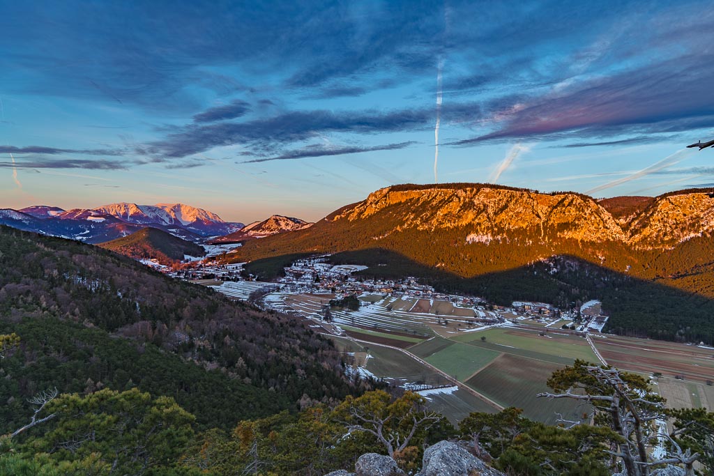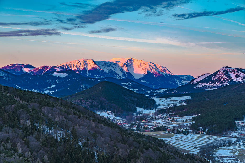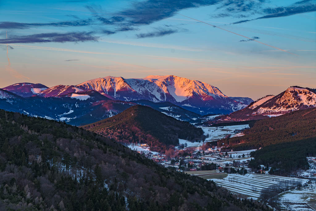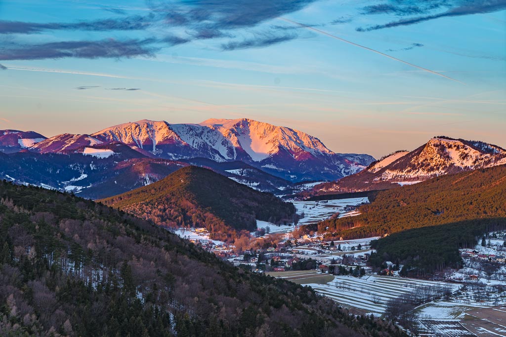 Schneeberg und Hohe Wand noch im Schatten.