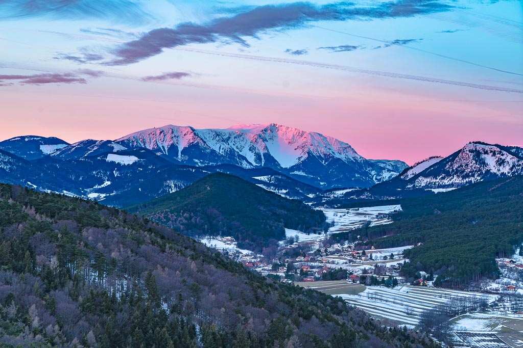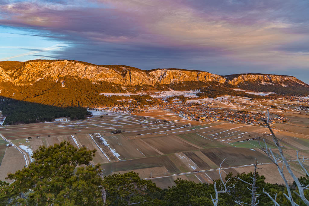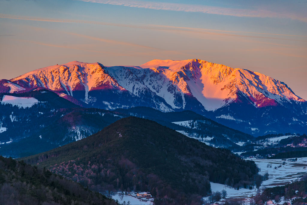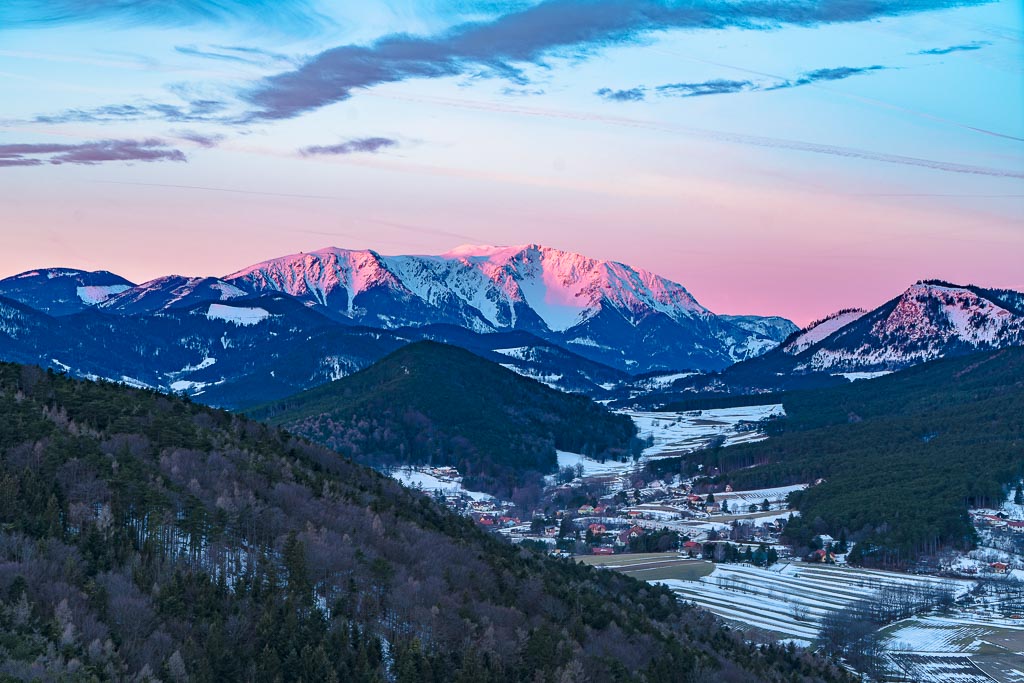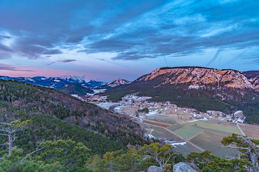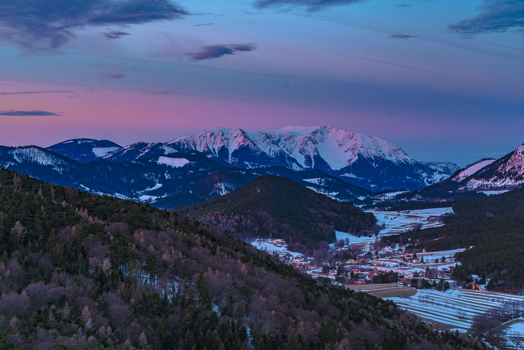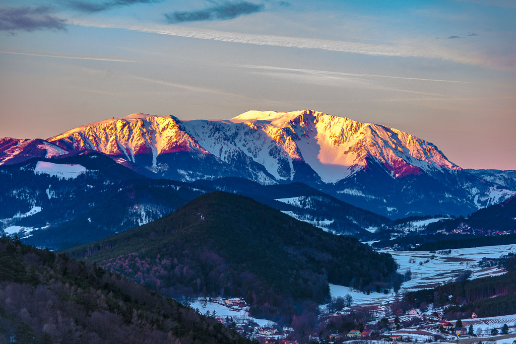 Schneeberg und Hohe Wand noch im Schatten.