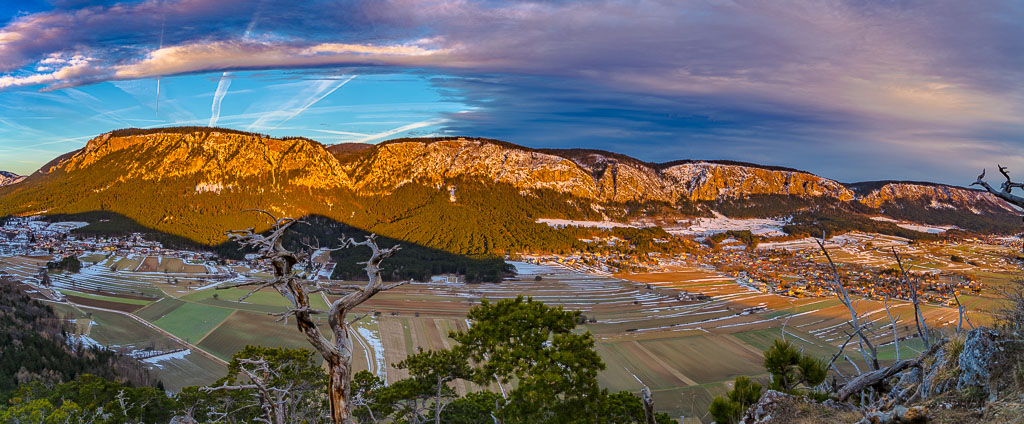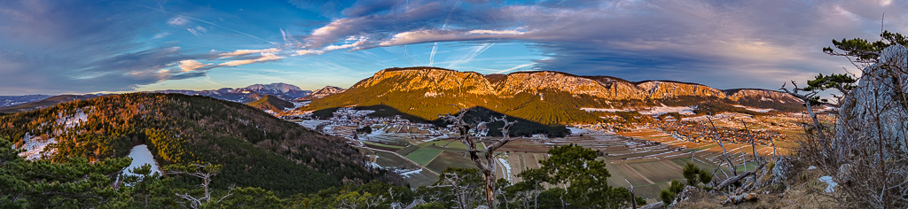 Teilpanorama, Hohe Wand. Links die Häuser von Zweiersdorf. Hierher oder ins Bild klicken für eine größere Darstellung.