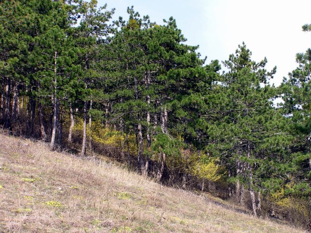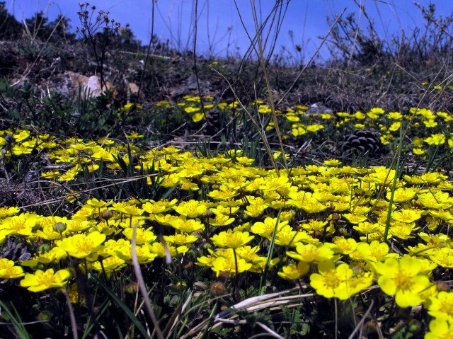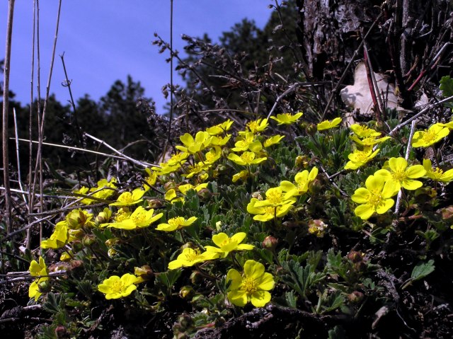 Carpets of sand - cinquefoil (Potentilla arenaria) cover the slope.