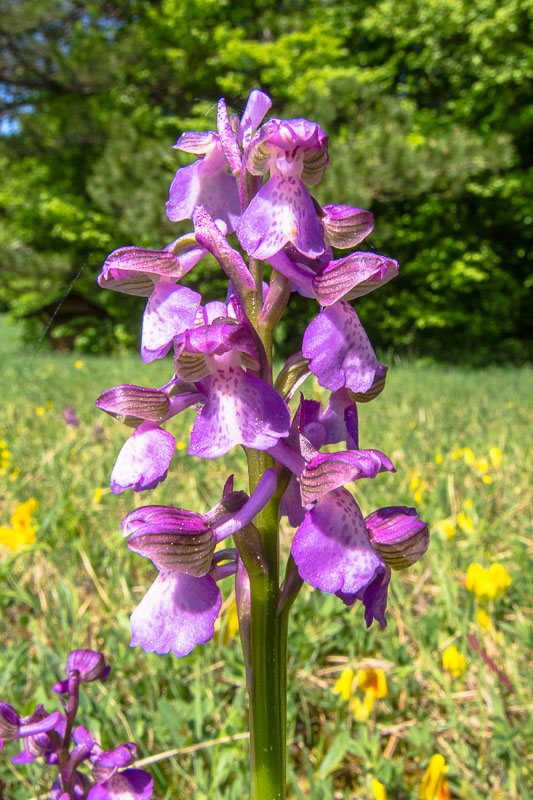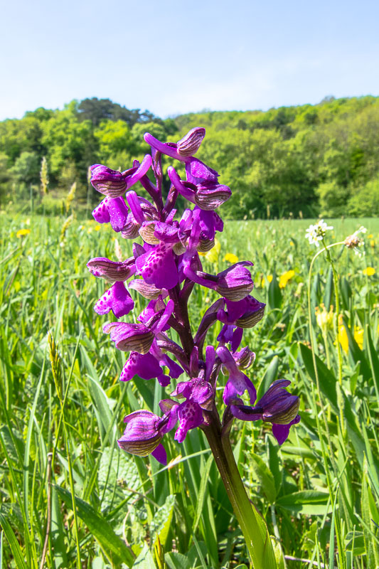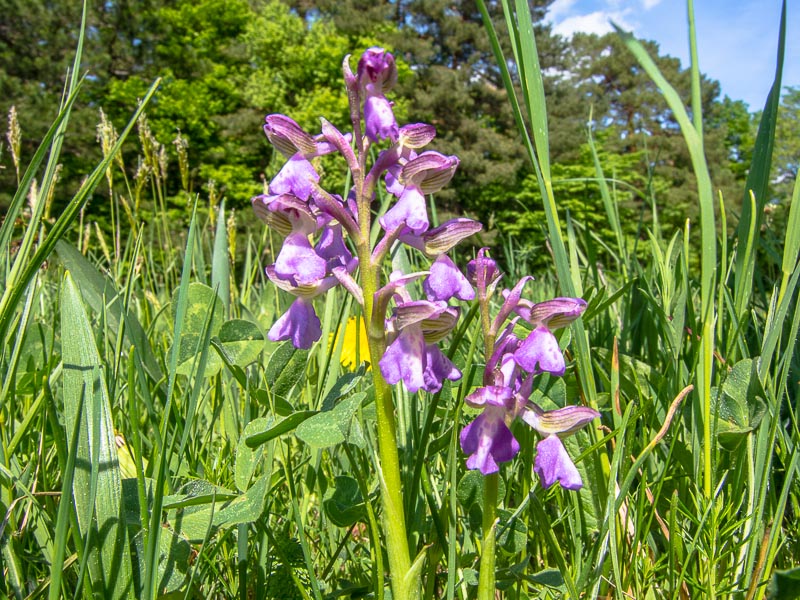 On a meadow besides the road Green winged orchids (Orchis morio) in different colour variants.