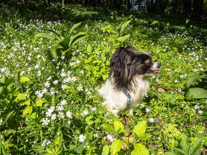 Lucy posing between Greater Stitchwort (Stellaria holostea)