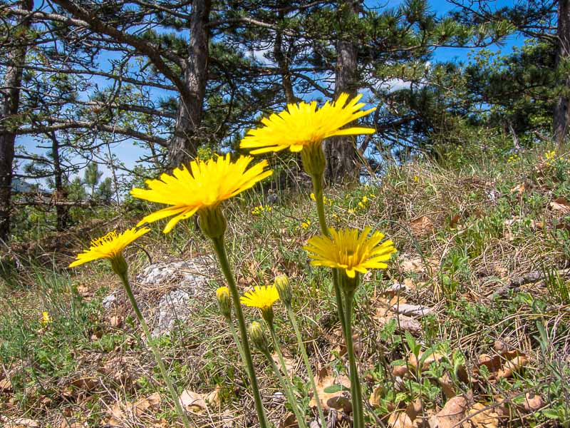 After walking for a while through flat forest of the plateau, all of a sudden the scenery changes: I stand in front of a steep escarpent with black pines.
