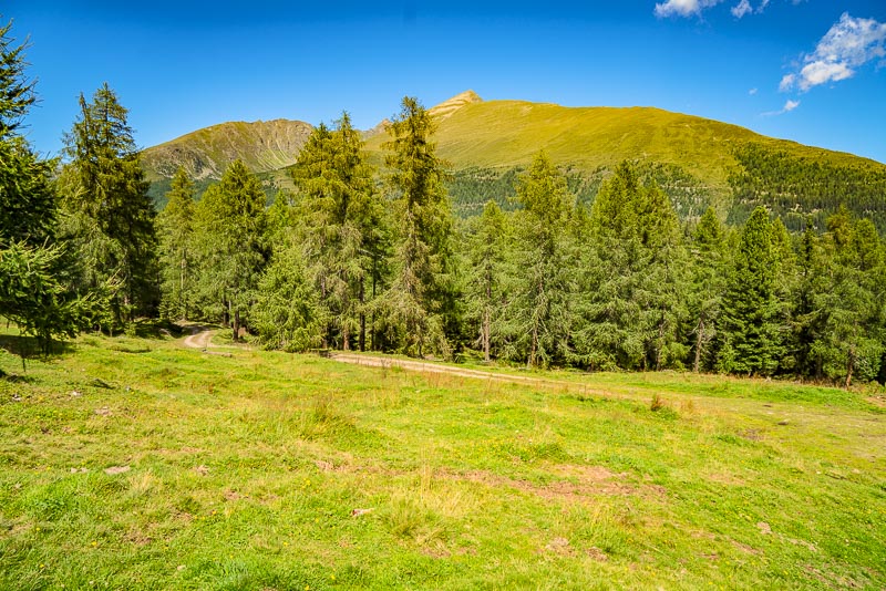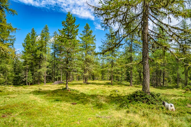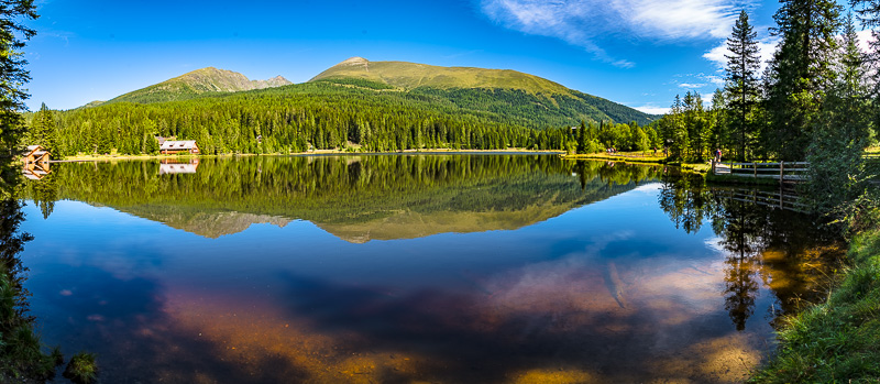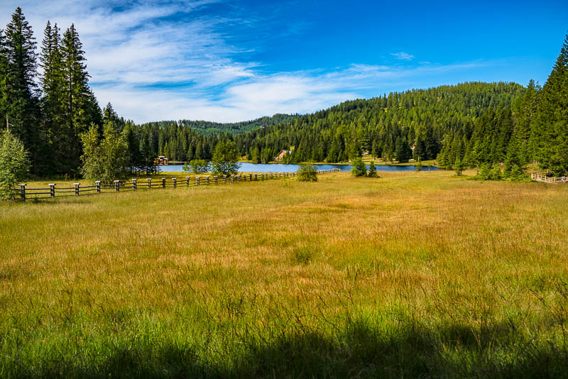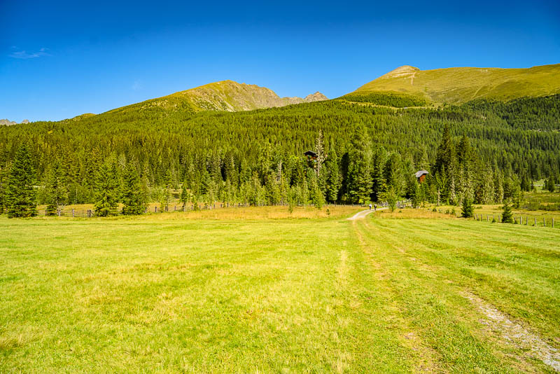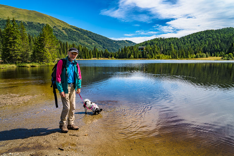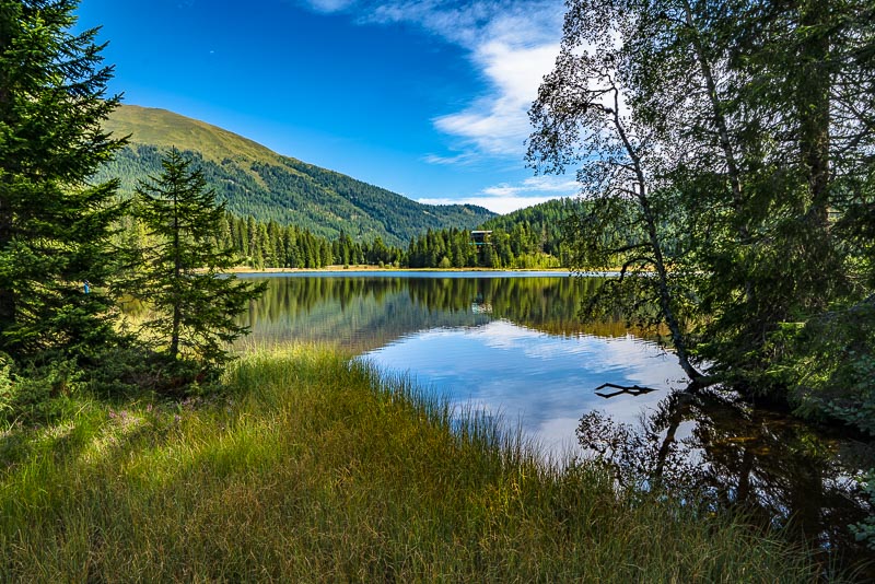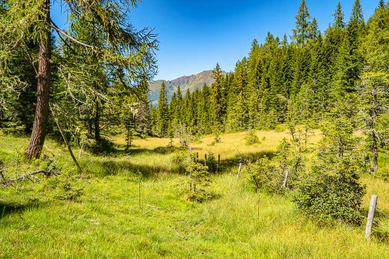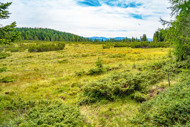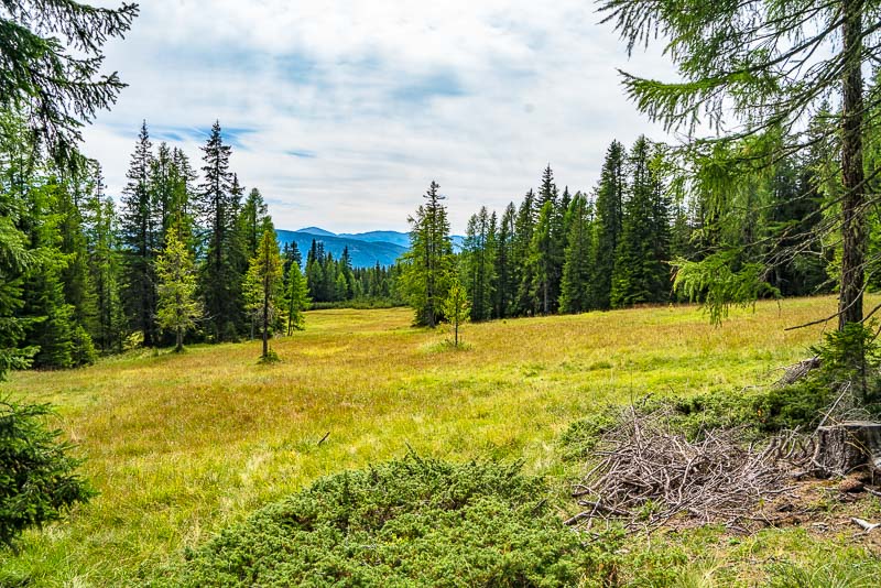 Wir fahren zum Prebersee, einem weiteren Moorsee, auf 1.514 m Seehöhe. Alle Parkplätze sind voll, Unmengen an Wanderern. Wir wandern daher nicht Richtung Niedere Tauern und Preber, sondern nach Süden, auf einsamen, unmarkierten Forststraßen, wo wir vollkommen alleine sind.