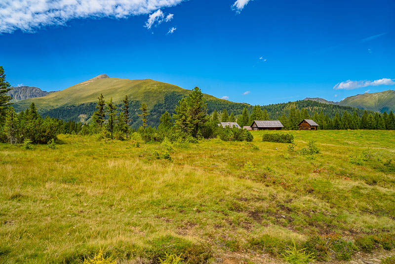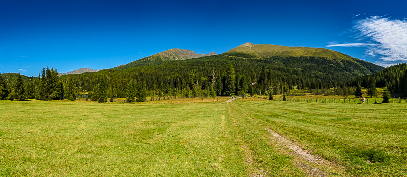 Panoramabild der Alm bei der Fritzenhütte, mit dem Preber im Hintergrund. Hierher oder ins Bild klicken für eine größere Darstellung.