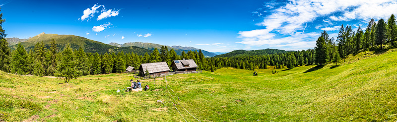 Panoramabild der Alm bei der Wengerhütte. Links hinten der Preber. Hierher oder ins Bild klicken für eine größere Darstellung.