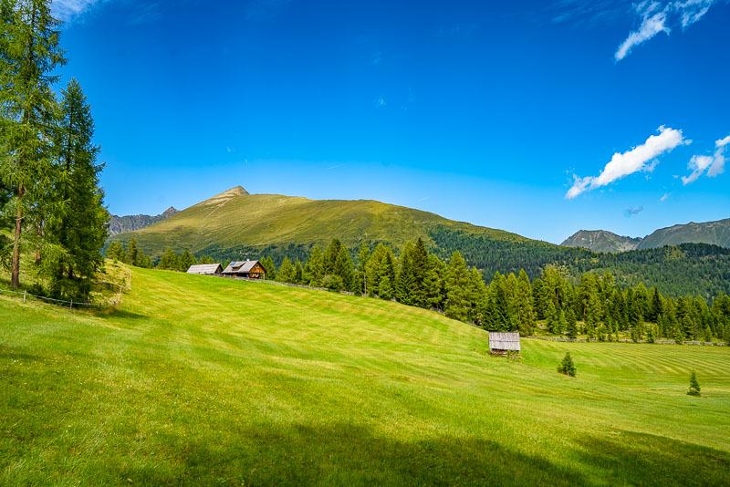 Futterwiese am sanften Abhang zum Prebersee. Dahinter der Preber. Hierher oder ins Bild klicken für eine größere Darstellung.
