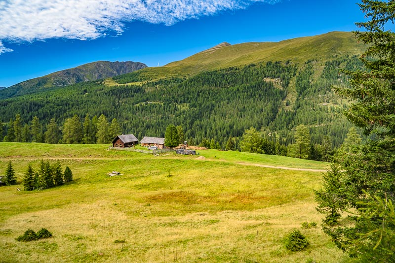 Zum Abstieg geht es wieder auf einer Forststraße um den Berg herum, dabei kommen wir bei einer weiteren Alm mit der Konradenhütte (ca. 1.620 m) vorbei.